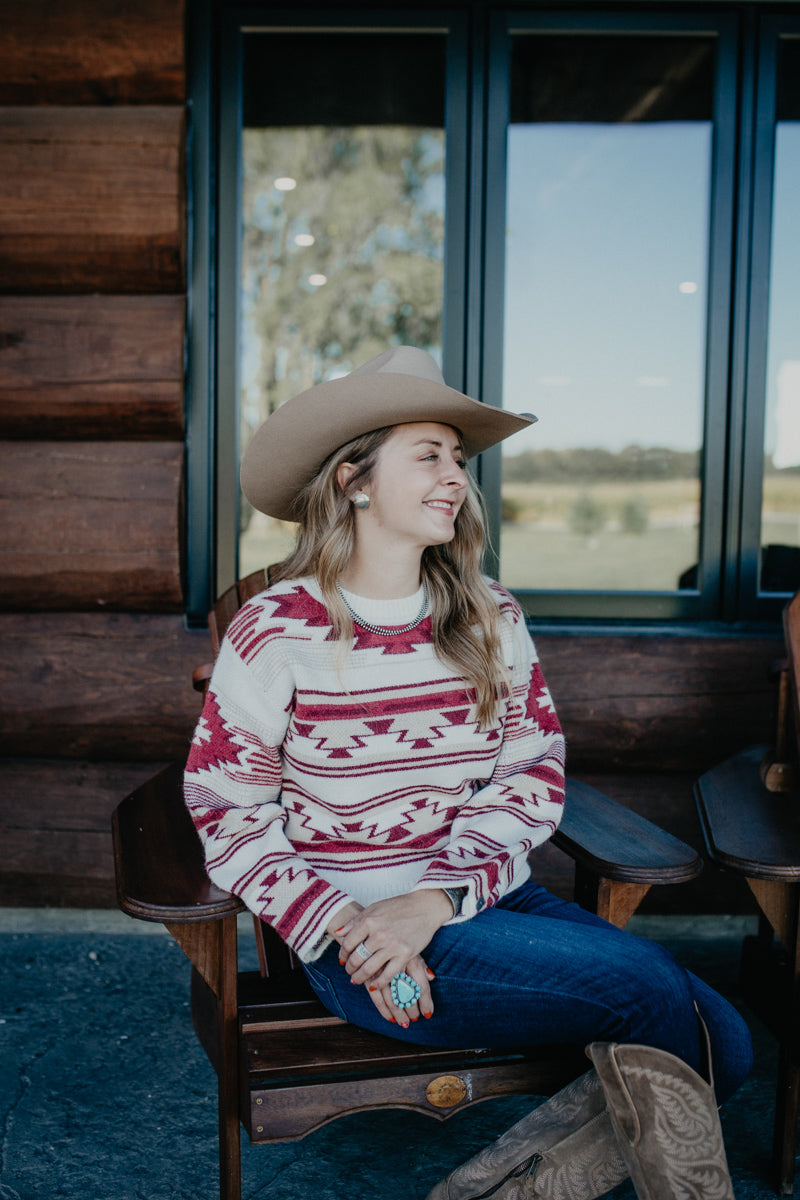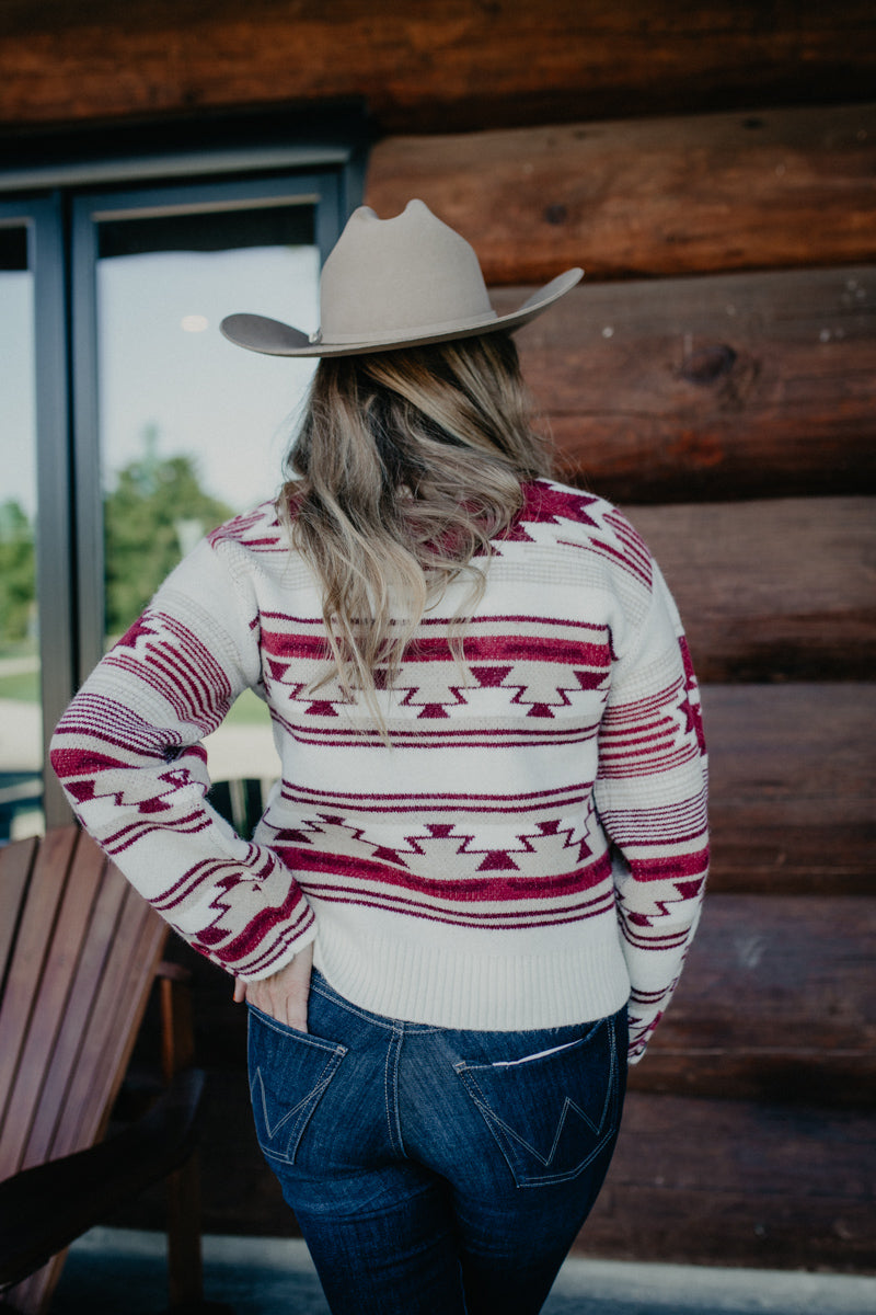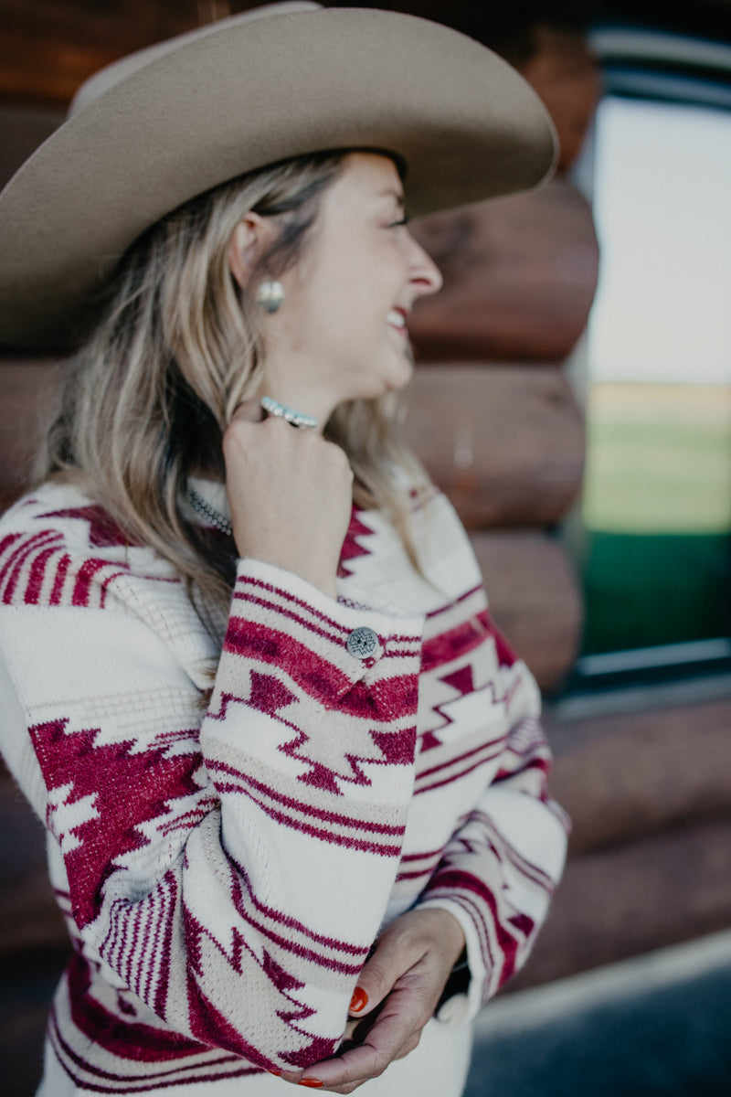 We love this stunning Aztec Knit sweater from Ariat. The Tan, Ivory and burgundy Aztec is perfect for this fall season and is sure to be the perfect knit sweater addition to your fall wardrobe. This knit sweater runs slightly cropped with a wider sleeve and beautiful button detailing on the sleeves. From family gatherings to gatherings around a fire this sweater is sure to keep you cozy and stylish.