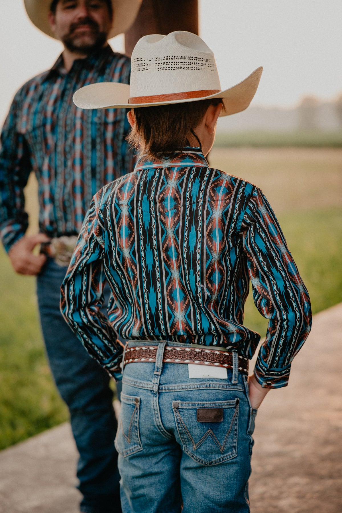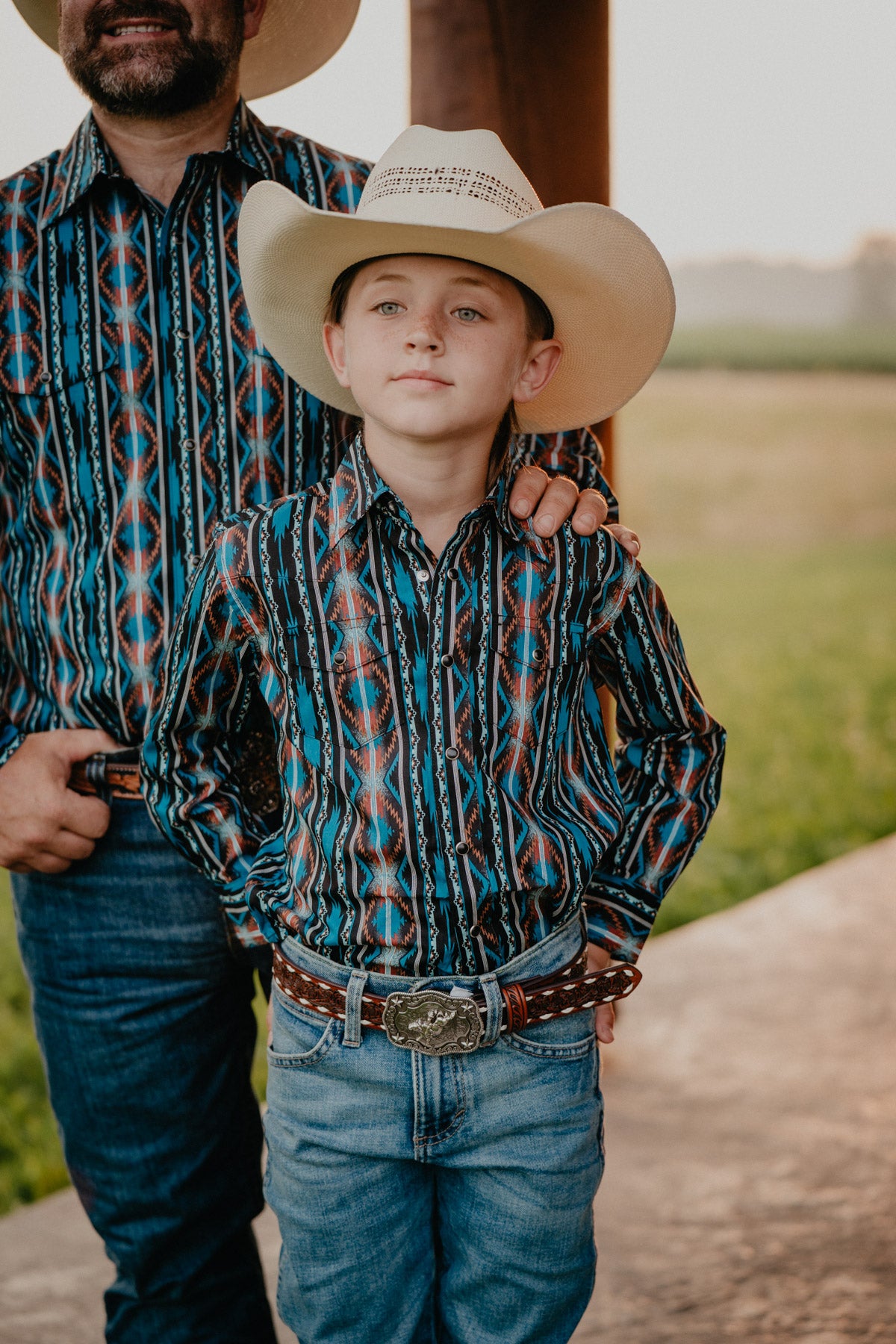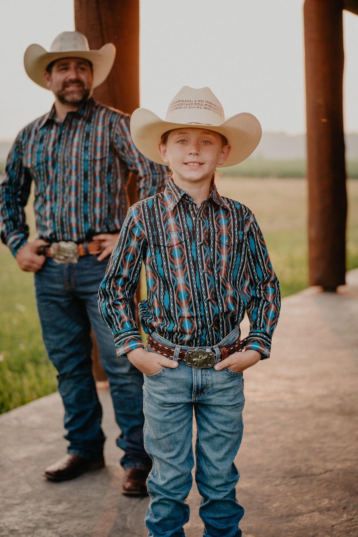 The 'Arlo JR' Retro pearl snap shirt brings classic cool to your little one’s wardrobe with its playful pearl snap print in blue, black, and rust tones. Designed with a comfortable classic fit and handy chest pockets, it’s perfect for everyday adventures. Plus, you can match with Dad for double the fun!