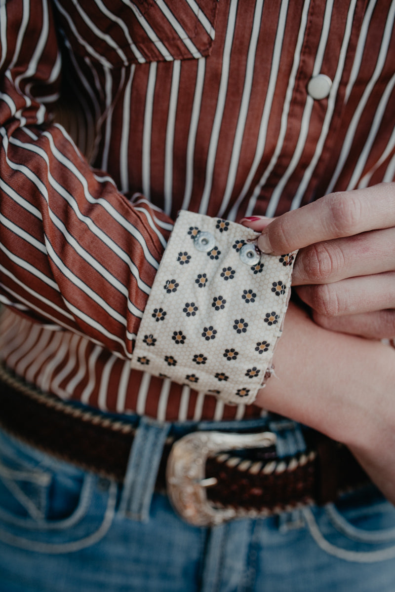 Add a splash of retro charm to your wardrobe with the 'Kyra' Burnt Rust Wrangler Pearl Snap! Its burnt orange and white stripes teamed with a white honeycomb cuff make every detail pop. Snap up style with full front pearl buttons and handy chest pockets, all wrapped in long sleeves and a classic shirt tail for a look that’s ready for whatever the day throws at you. This burnt rust pearl snap is perfect for fall!