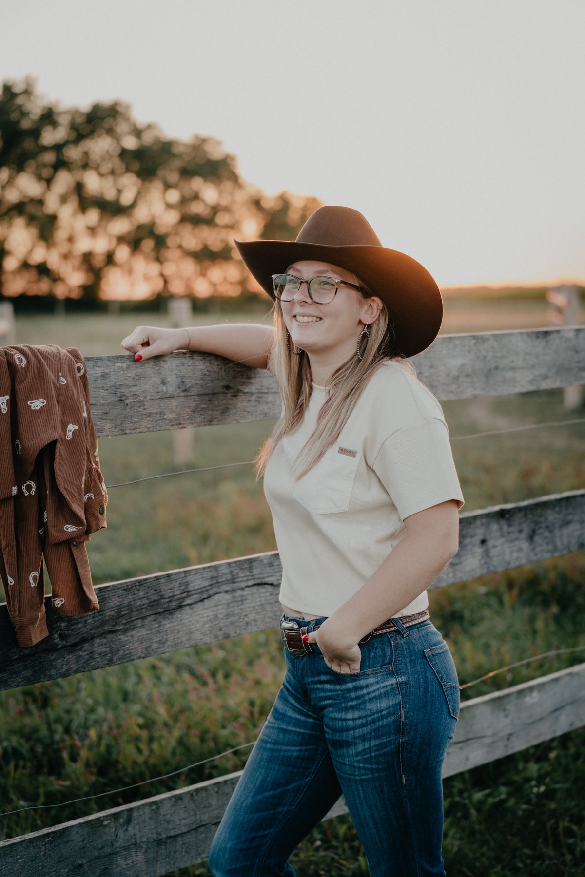 A wardrobe staple piece you'll love no matter the season, this cream coloured boot stitch pocket tee is such a cute top by Ariat! The slight cropped, boxy fit makes this tee easy and effortless to pair with your fav high waisted denim!