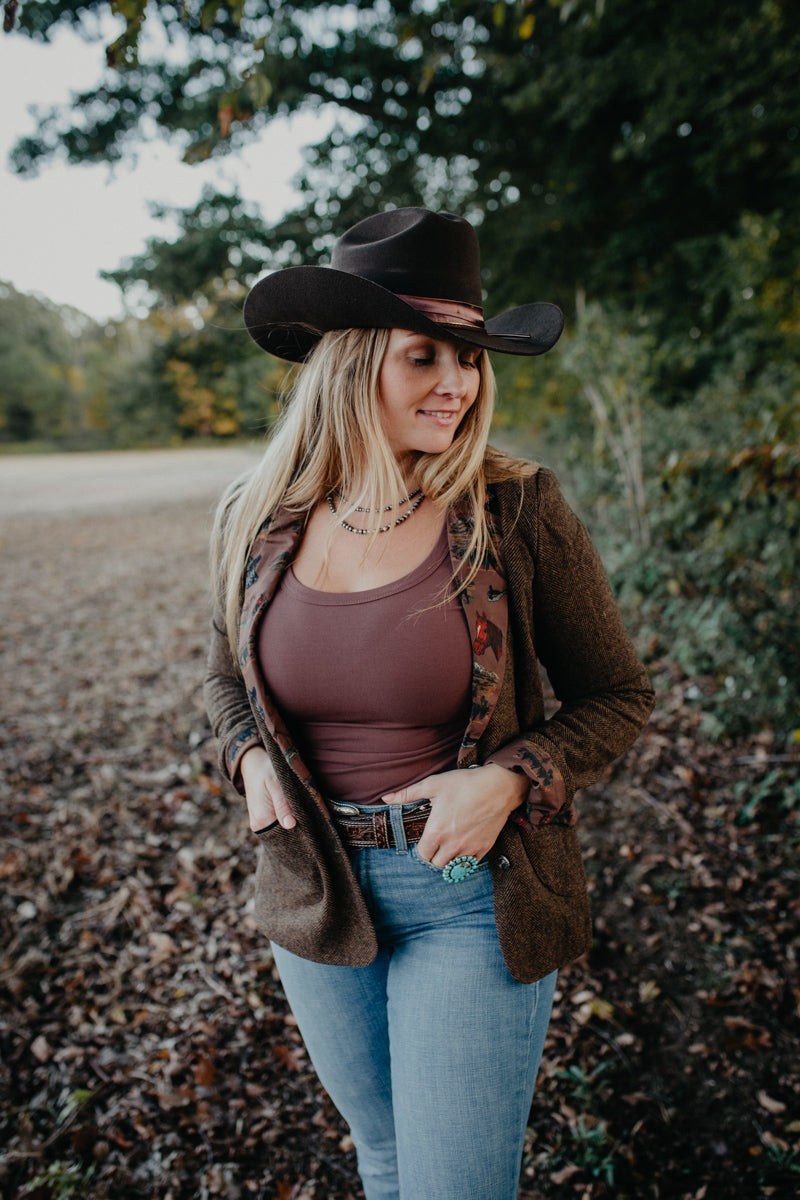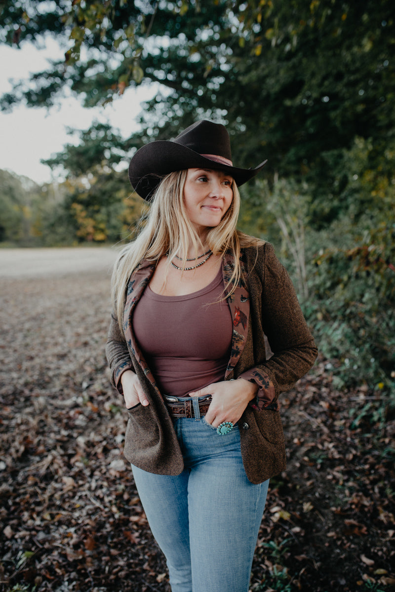 Its been over a year in the making and we couldn't be more excited to introduce you to the 'Bar C', our very own CC Exclusive Western style blazer. This beauty is a classy, vintage inspired and timeless cowgirl cowgirl piece that will quickly become a cherished addition to your wardrobe. From the handpicked wool fabric, to the custom printed fabric, this blazer was an absolute joy to watch come to life. We are so excited to offer this amazing quality piece and know you are going to love it forever to! With a beautiful versatile brown tone chevron pattern, exclusive Cold Cactus printed lapel, jetted pocket flap detail on the functional pockets, this piece is an absolute knockout! So easy to style for daily wear, the office or dressing up! We know you will fall in love with this one and are so excited to finally share it! We carefully designed this functional piece - with things such as arm length in mind. Long arms? No problem - we designed her with extra arm length. Short arms? Also no problem - the sleeve is lined with coordinating printed fabric for a cute cuffed look!