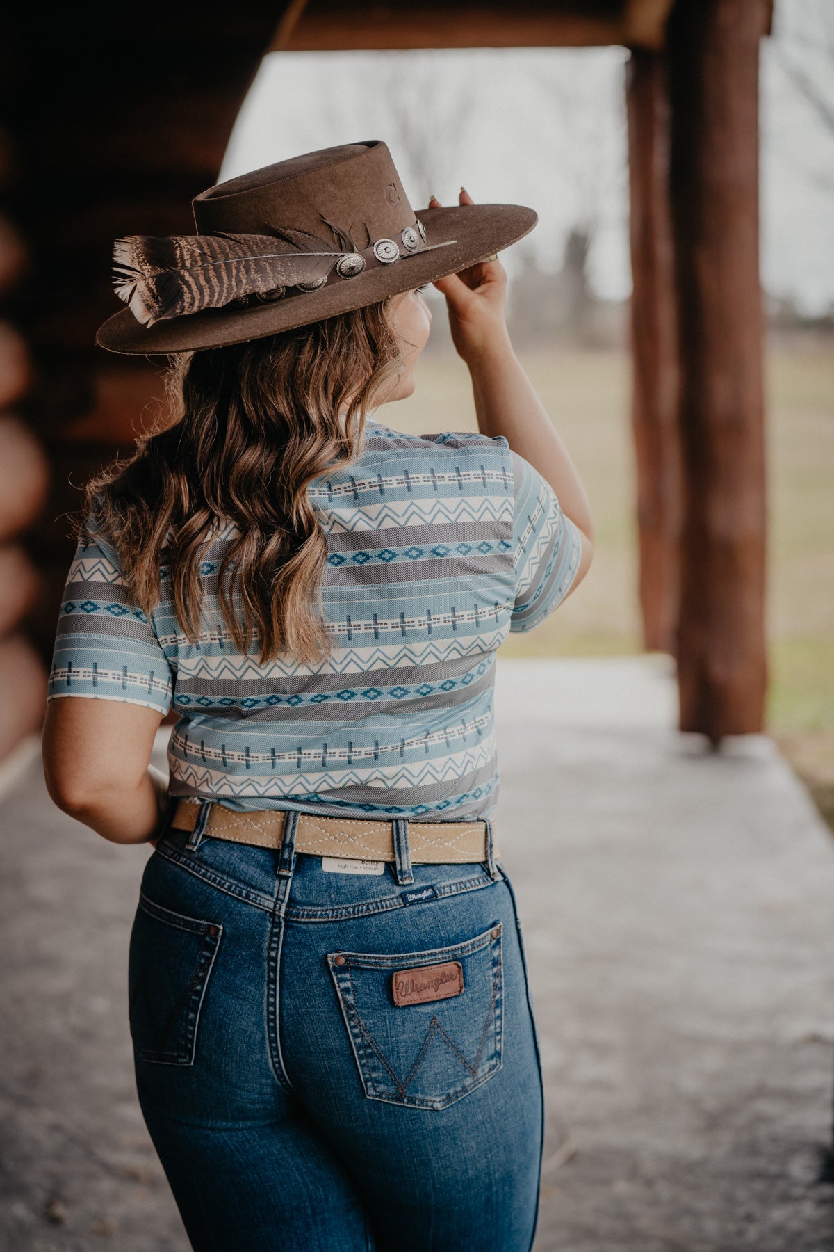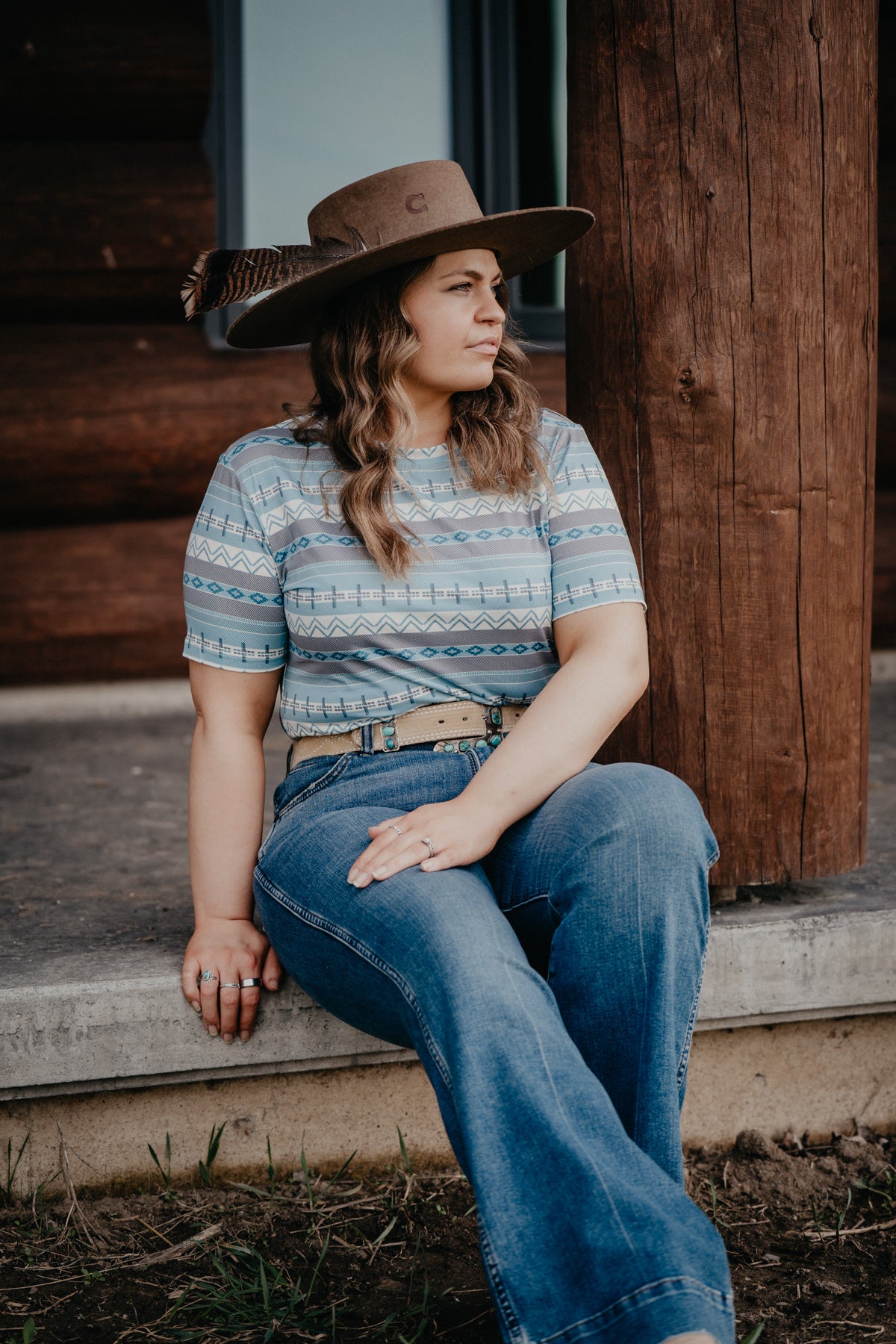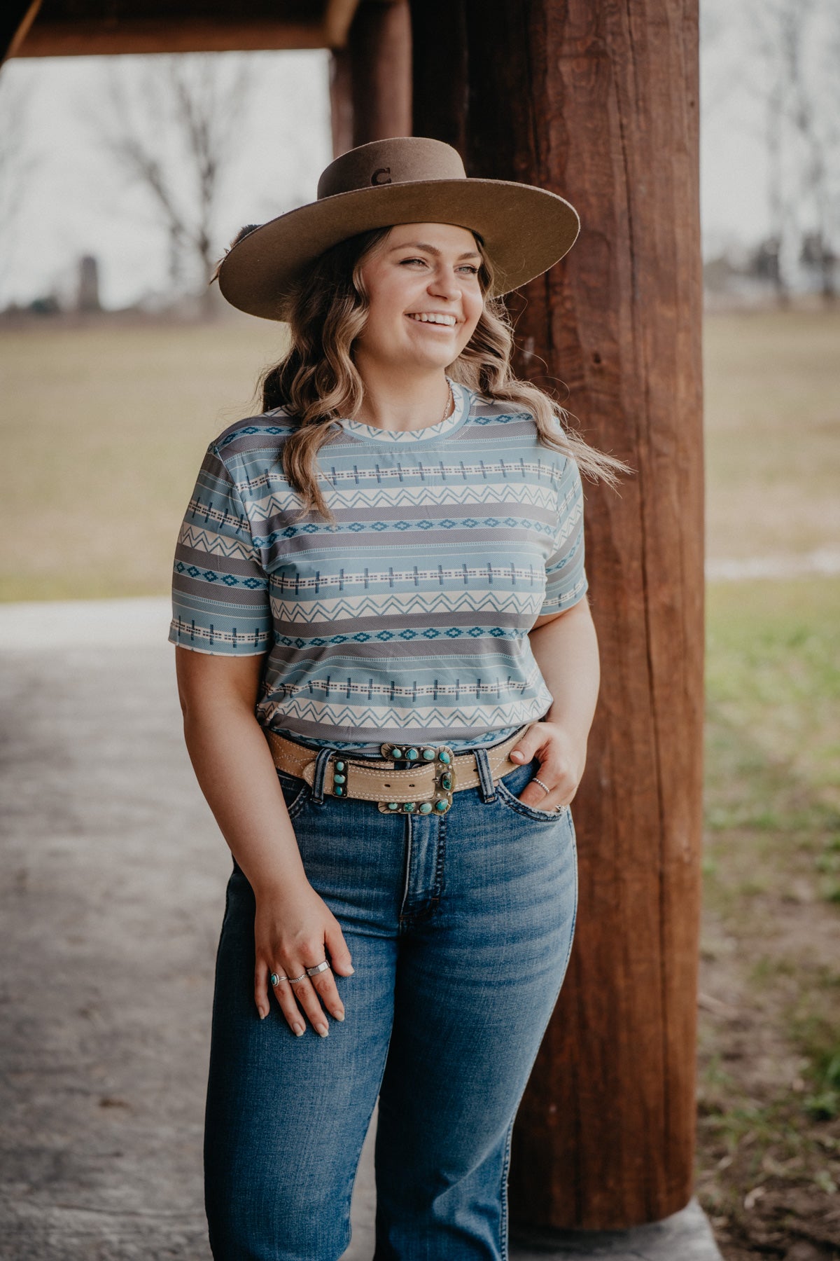Amp up your essential tee collection with this stylish blue super soft tee from Cruel Denim! Perfect for everyday wear, arena wear, or sports wear. Featuring a Southwest print and a flexible design, this shirt offers exceptional comfort and pairs effortlessly with any denim you own!