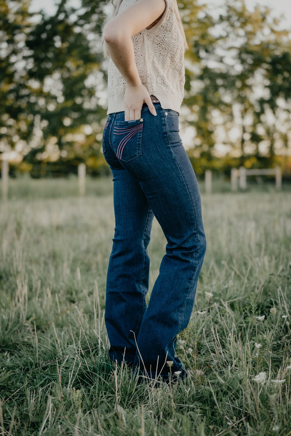 We absolutely love our Dojos around here and had to bring in another super buttery soft 7FMK Dojo trouser style for you! These new ultra dark blue wash trousers with unique dark pink stitching are so comfortable and stretchy, they don't even feel like jeans, trust us on this one... we live in these! Such impeccable quality, style and flattering fit, these Dojos will be a favourite! The Dojo style is a mid rise flare, with a slimming fit through the bum and thighs. The standard 34.5" inseam on these are perfect for everyday wear, dressing up with booties, to wear in the saddle and everything in between. These are a limited edition style and wont last long so act quick!