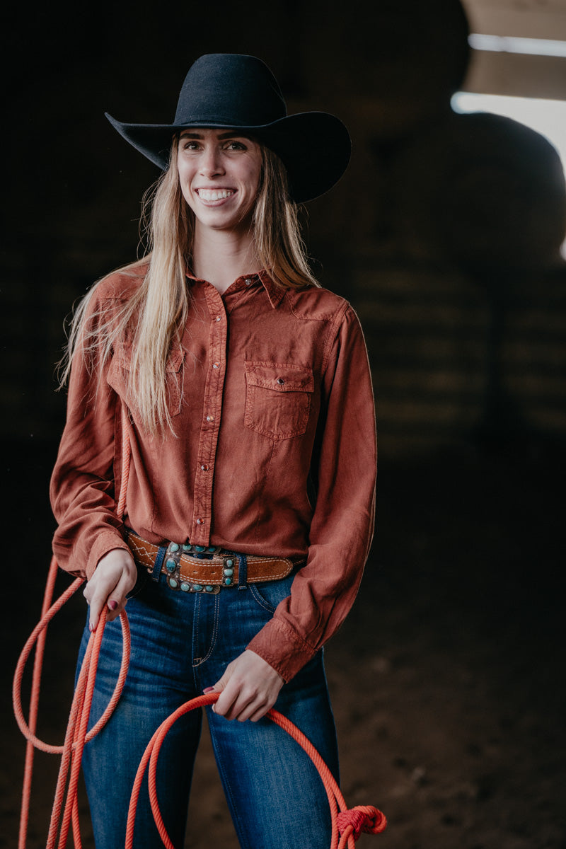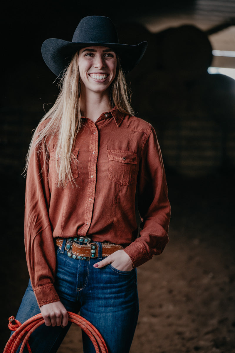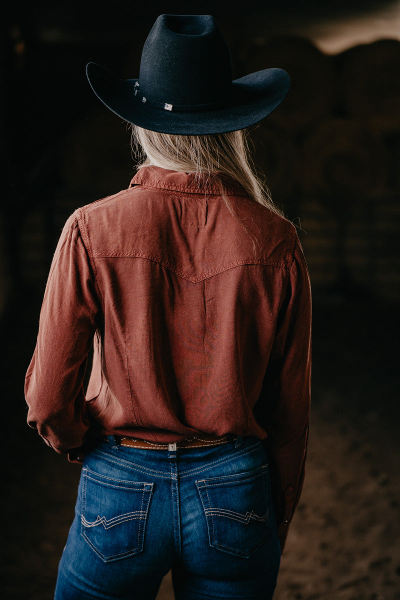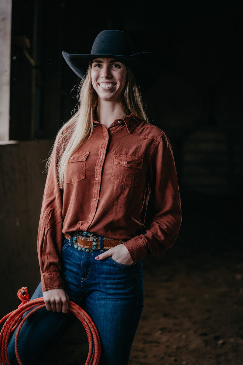 This rust-coloured 'Clover' top from Cotton and Rye features a bright pearl snap closure that adds a fun, fresh touch. Made from soft, comfortable brushed rayon, it’s flattering and perfect for layering your favourite looks. Simple yet stylish, it’s the playful piece your wardrobe’s been waiting for!