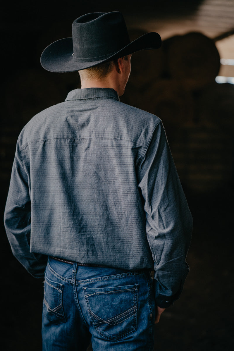 Get ready to channel your inner CoJo with the 'Johnny' Men's Cody Johnson One Pocket Button Down Shirt! This black shadow button-down blends classic western style with all-day comfort, thanks to its soft cotton fabric. With a hidden button-down collar, one chest pocket, and the COJO logo on the left cuff, this shirt makes sure you stand out—whether you’re at a concert or just out on the town!