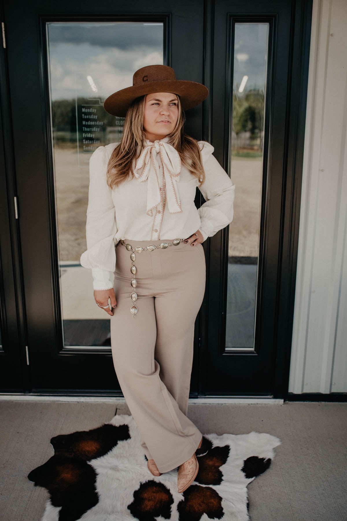 Sarah has this styled 2 ways. Paired with 'Sabel' Tank Top. Also paired with our 'Clara' bow linen blouse and 'Aviana' Stetson tooled booties.