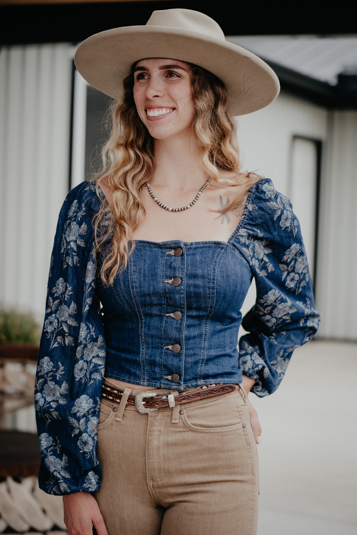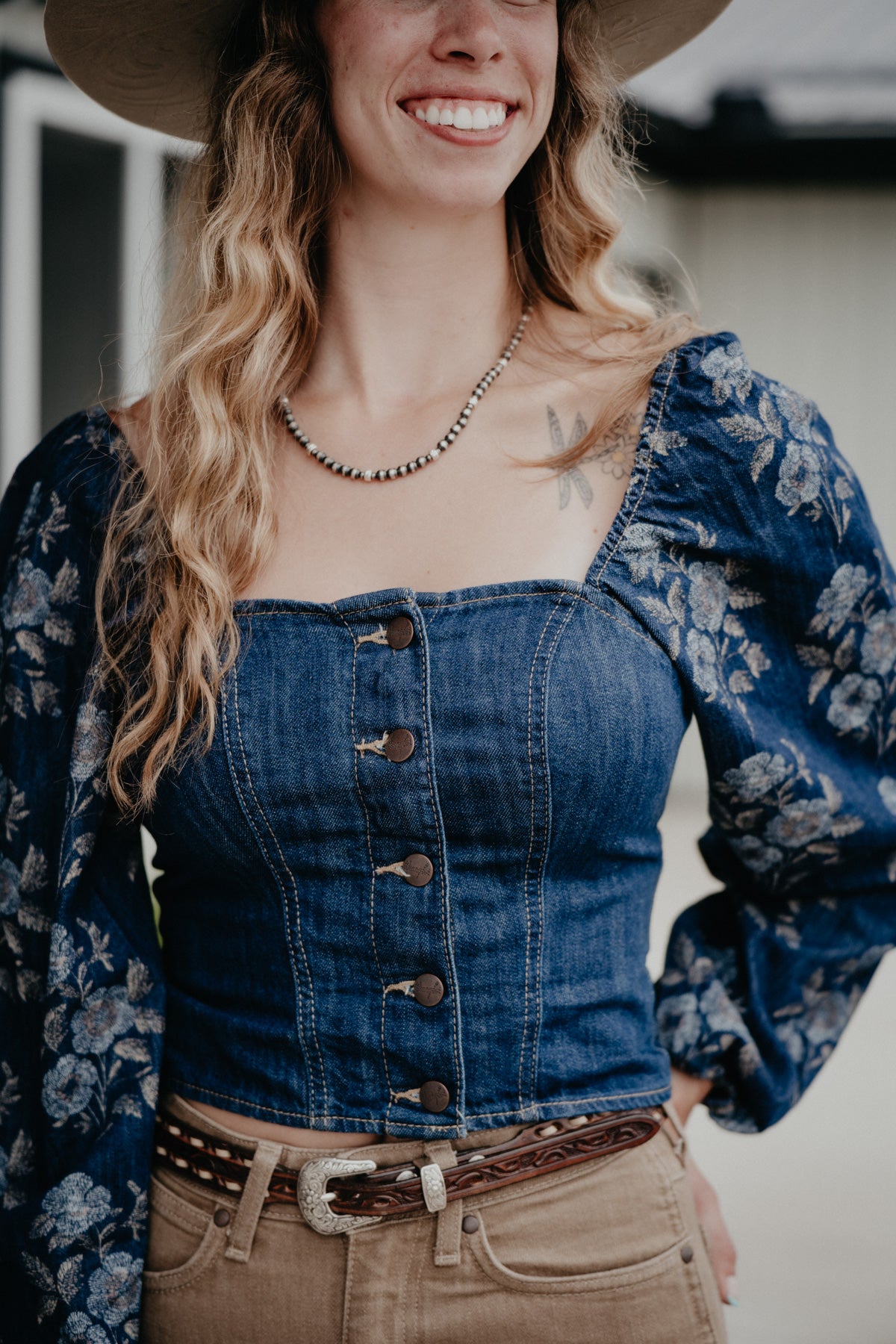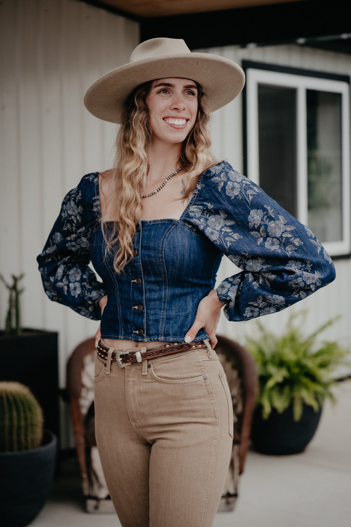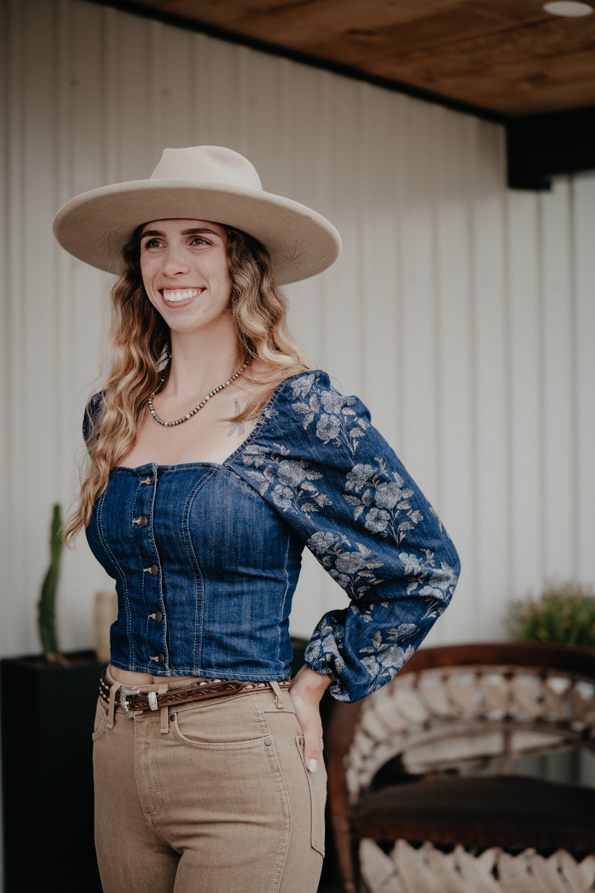 Looking for a little prairie and a little spice? This flirty cropped top is giving us all those vibes! With voluminous balloon sleeves woven in a floral pattern, a fitted corset-style bodice, and a square neckline that can be worn on or off the shoulder—it’s equal parts sweet and striking. Pair it with high-rise denim and your favourite boots for an outfit that turns heads from the barn to brunch!
