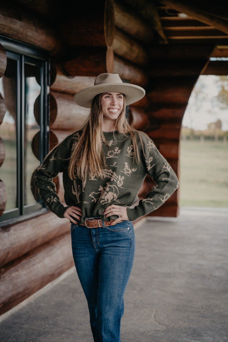 Get ready to lasso compliments in the 'Freeman' Rodeo Quincy Knit sweater. Available in black and emerald, this crewneck sweater features fun and playful designs of cowboys, cacti, and fence lines. The emerald colorway adds a touch of tan to the designs, while the black colorway features white designs. Get your inner cowboy on with this quirky and unique sweater!
