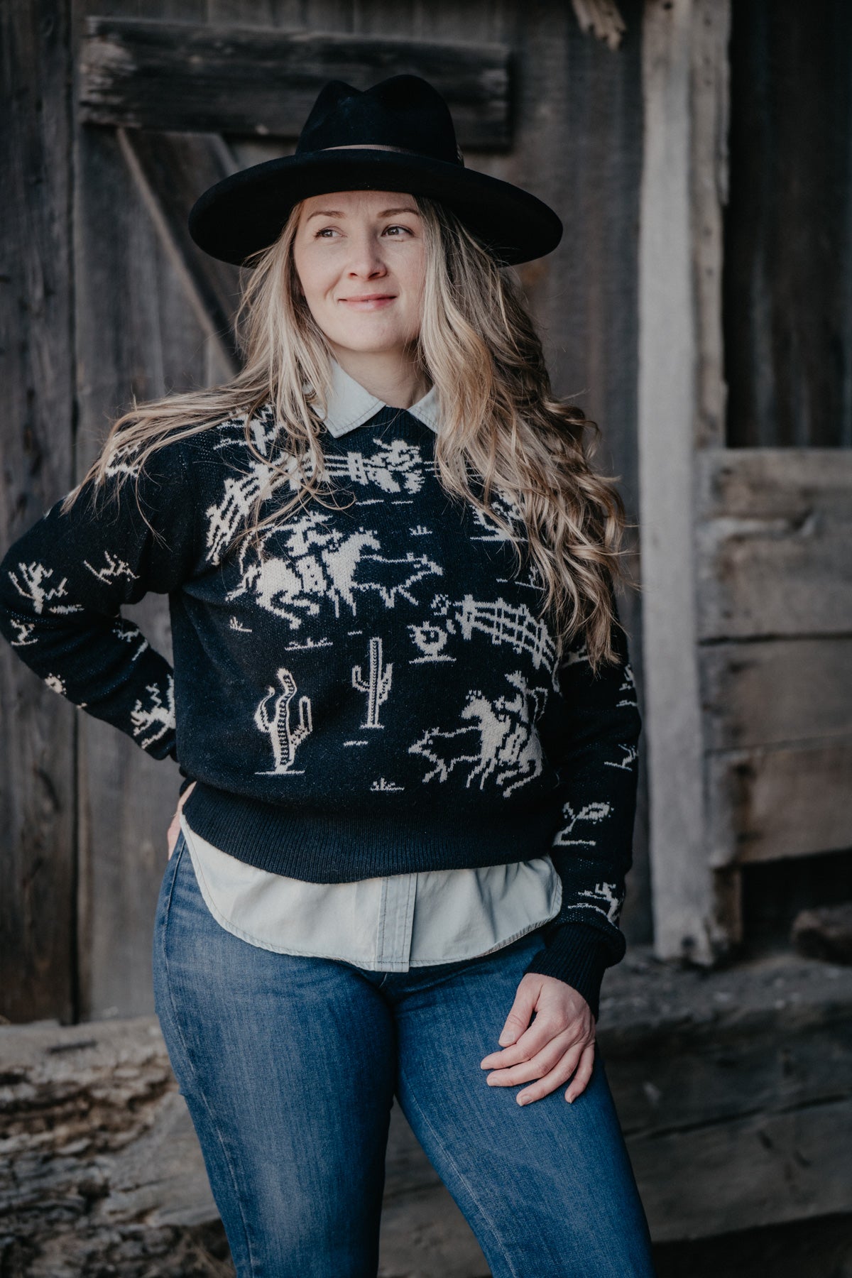 - Cowboys, cacti and fence line designs throughout the sweater
