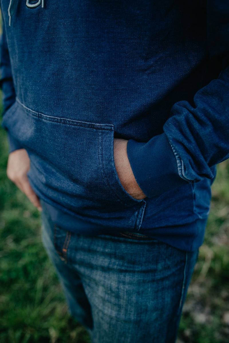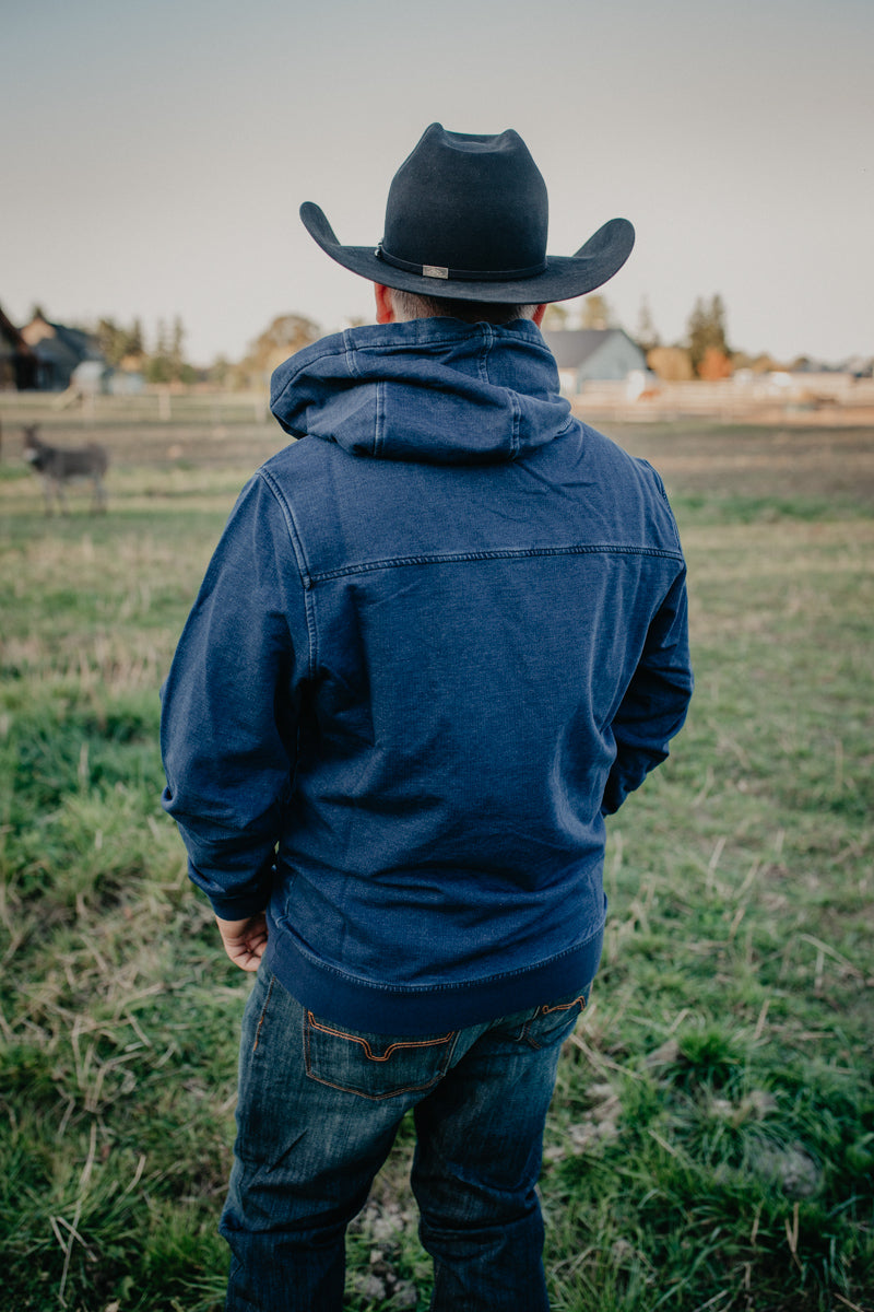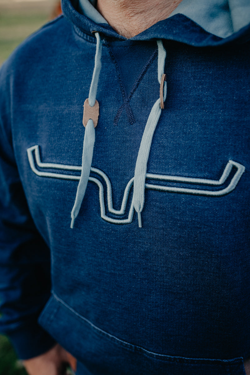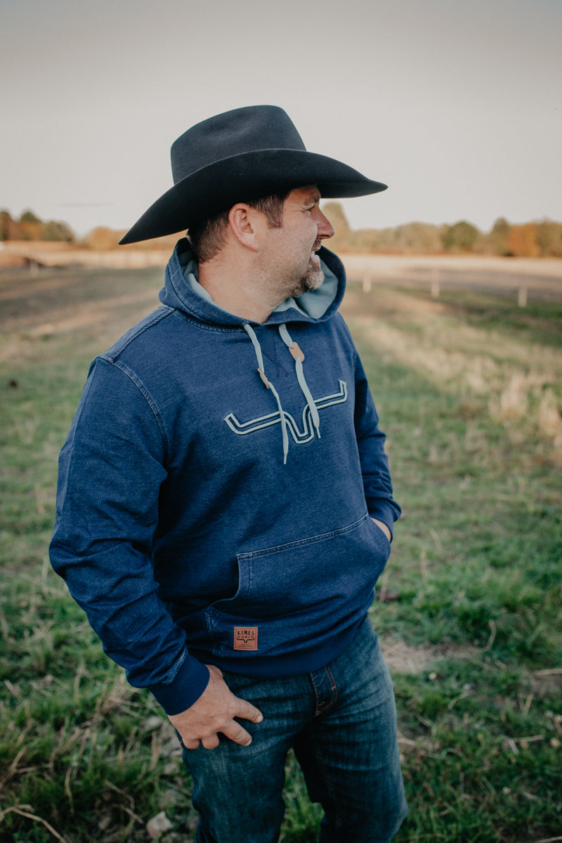 We are loving the colour of this stunning indigo hoodie. This super stunning hoodie has a denim wash, kangaroo pocket with leather Kimes Patch and an embroidered iconic Kimes Horns logo. We are loving the matching contrast logo, Drawstrings and hood liner. This is a perfect heavier weight sweater for those cooler nights at the barn or the upcoming snowy weather.