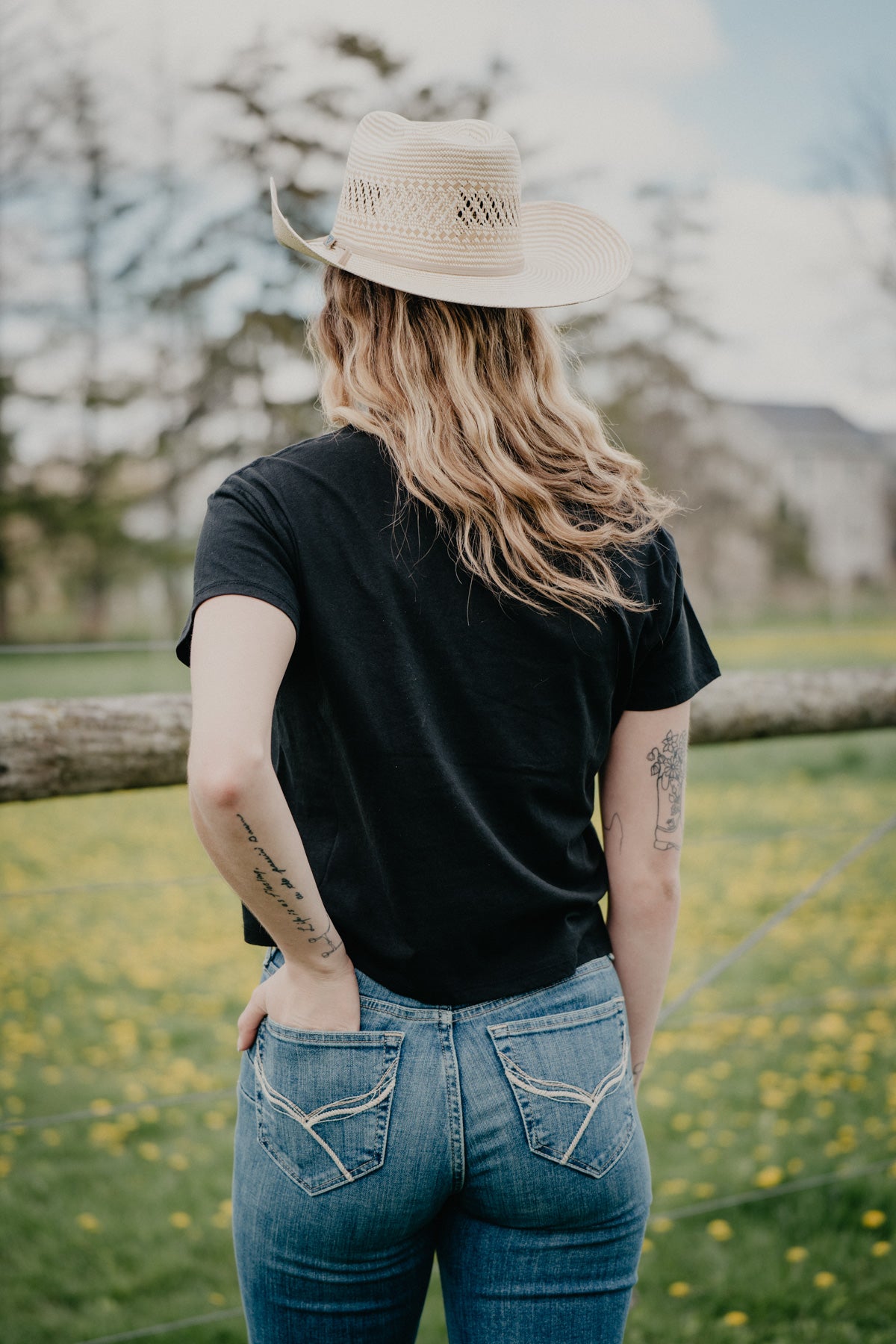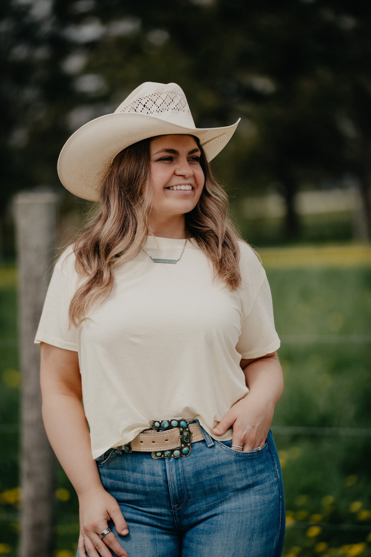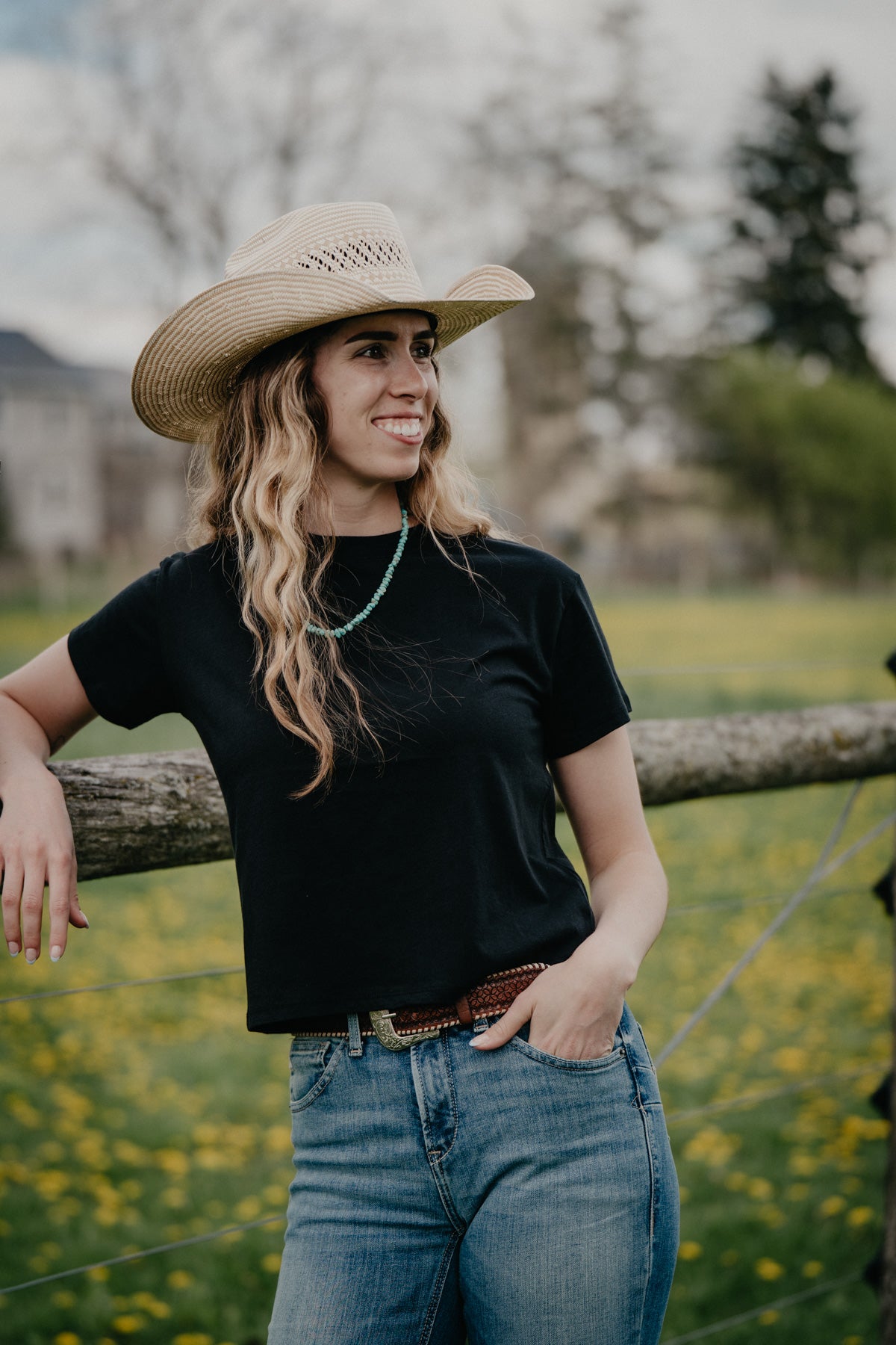 Your wardrobe is in need of this classic 100% cotton cropped t-shirt, designed for ultimate comfort and versatility! This must-have piece effortlessly pairs with your favourite jeans and cowboy boots for a laid-back look or can be dressed up with a skirt for a night out. Soft, breathable, and stylish, it’s destined to become your new "Go-To" staple!