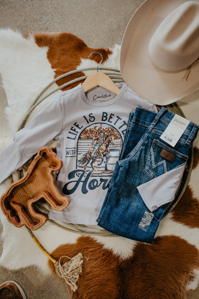 This adorable long sleeve shirt by Cruel Denim Brand displays the cutest barrel racer design featuring 'life is better with fast horses' in a quote around the graphic. This tee is so soft and will be grabbed for again and again by your little cowgirl!