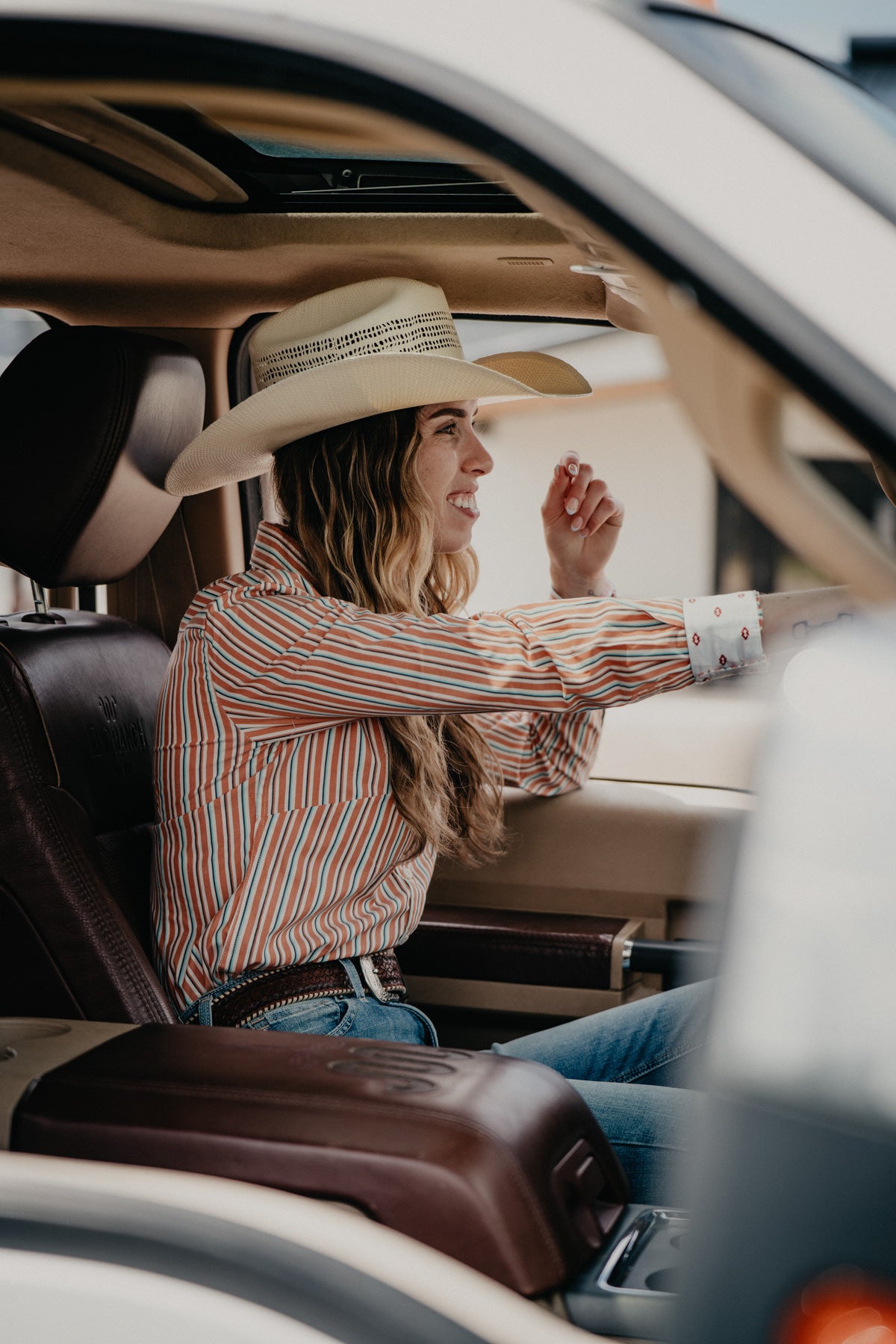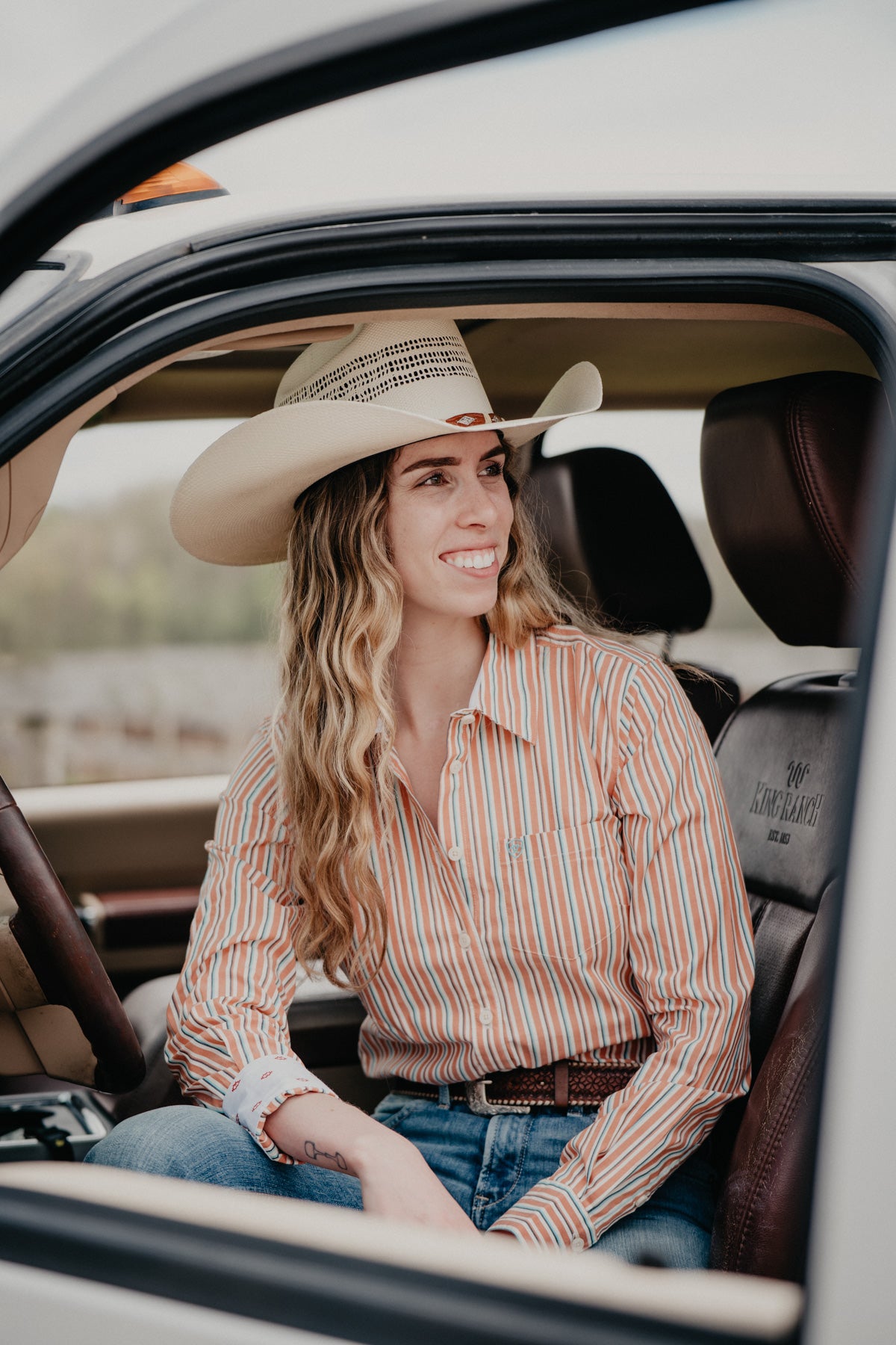 Ariat Kirby button up's are a staple around here and for good reason! Breathable material for comfortable all day wear, and classic fit that tucks into jeans easily and will stay put while riding, doing chores, or headed into town; this shirt has you covered! We love the retro pin stripe in an orange, blue, and ivory colour palette along with the contrast ivory and navy aztec cuff.