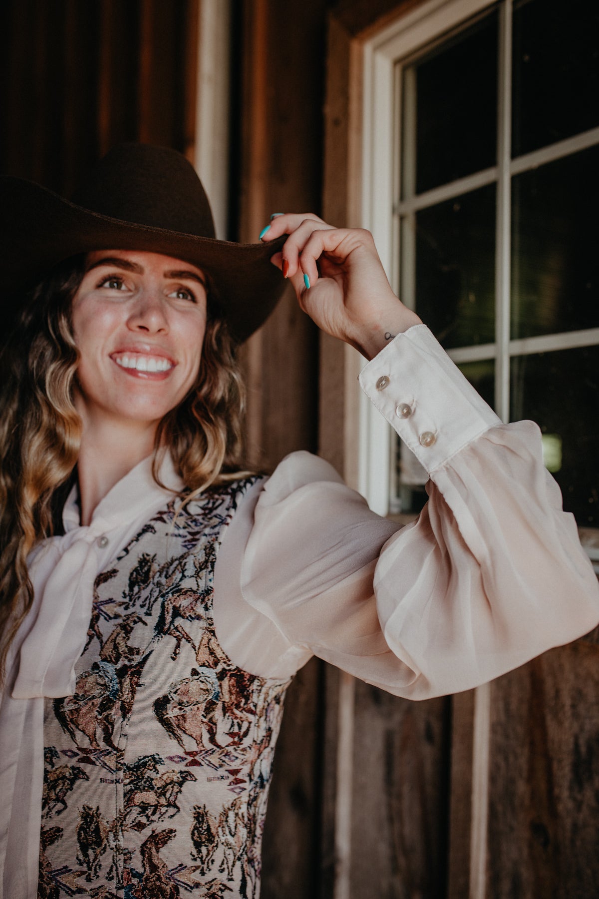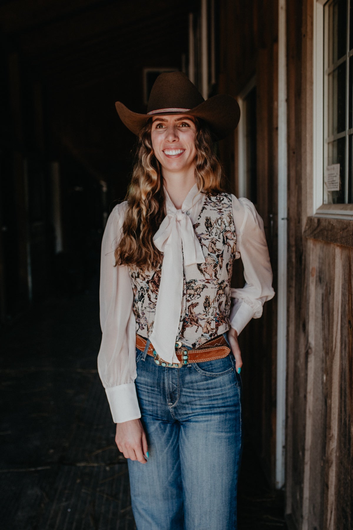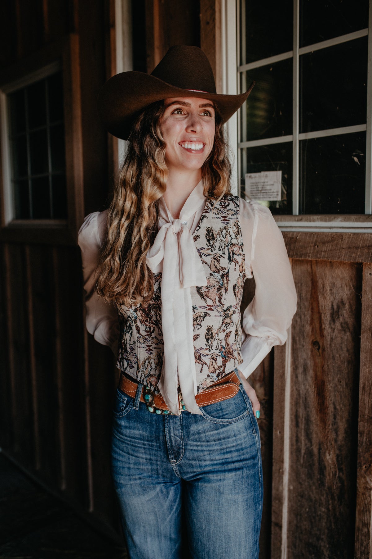 Paired with our 'Rosalie' ultra high rise wide leg trouser and 'Dawn' Buckaroo vest.