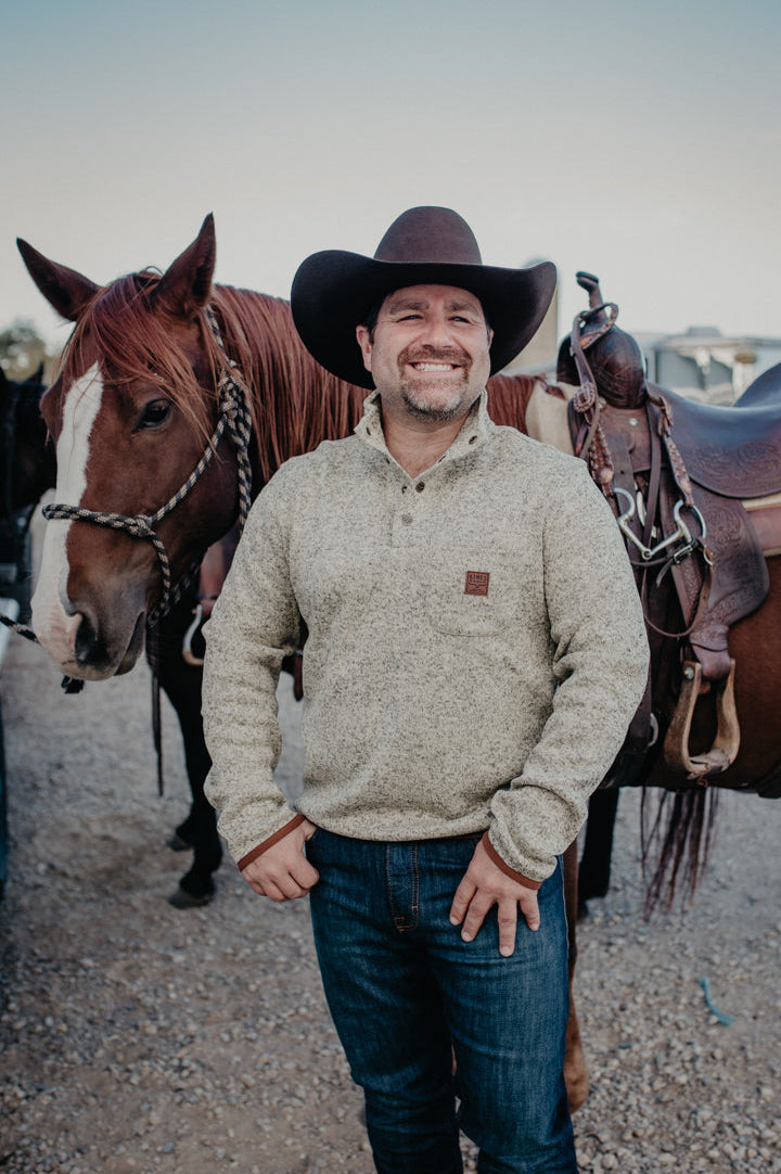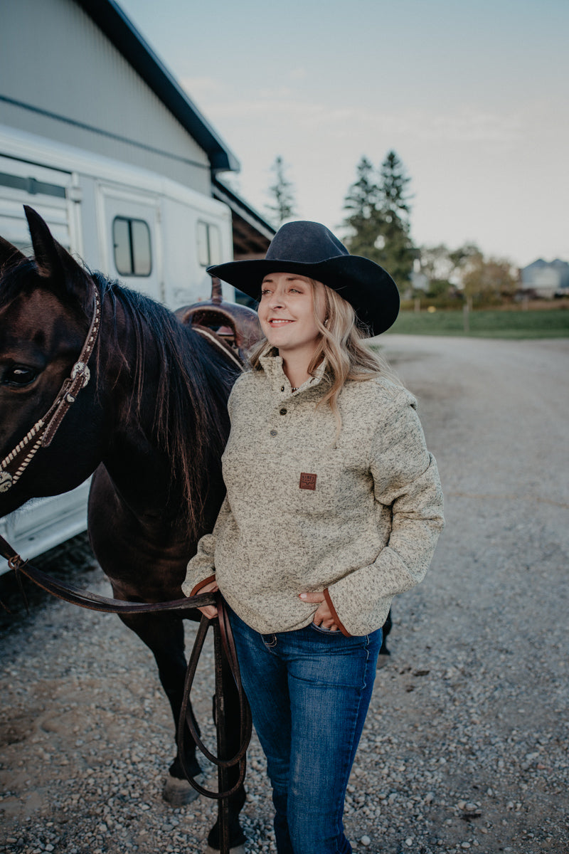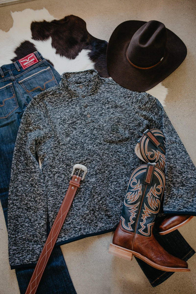 We are loving this 'Kimes" Pullover! This sweater is stunning coming to our collection in 2 colour ways Natural and Black and with a heathered finish. This sweater comes with 4 metal stamped snaps as a mock 1/4 closure and also has a super convenient chest pocket with a 'Kimes' stamped leather patch. This sweater is a great option for Family Gatherings, family photos or simply a dinner out with some friends paired with your favourite Denim.