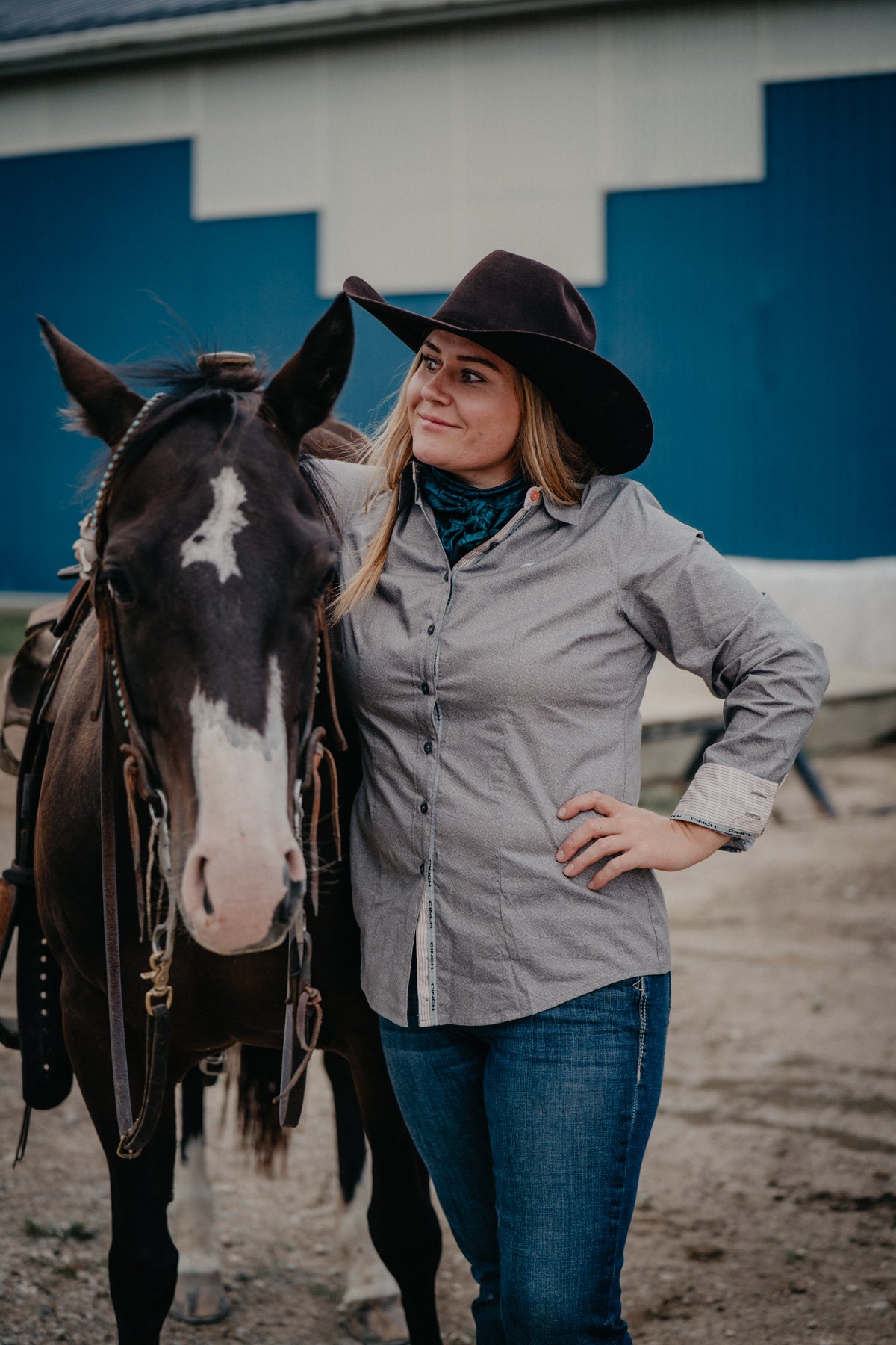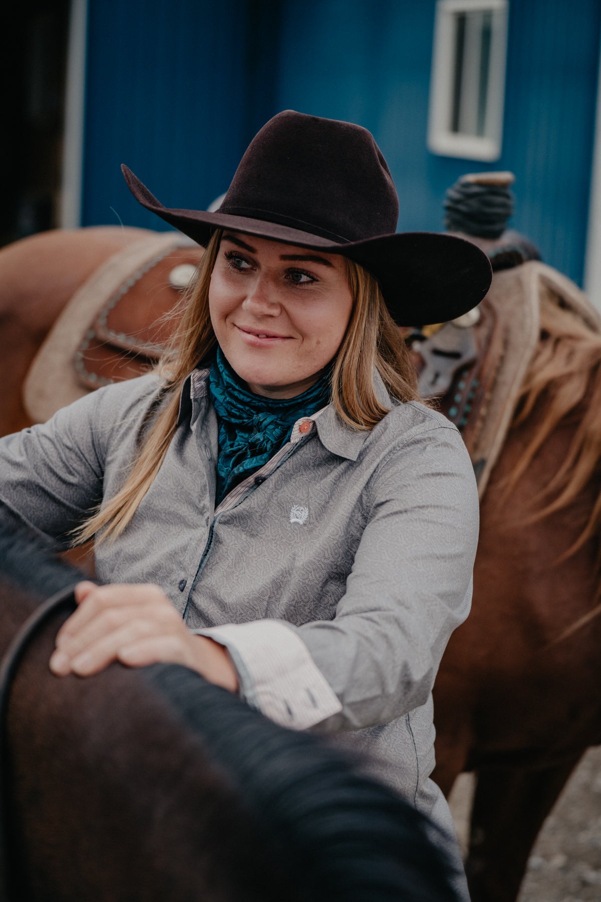 Step into the arena with confidence in our “Kels” CINCH button up. The timeless grey paisley print gives it a cute yet professional look, while CINCH’s trusted construction ensures it keeps up with the demands of rodeo and show life. Designed with classic CINCH fit, this shirt is both flattering and functional, moving with you through every ride. Whether you’re in the saddle or ringside, the “Kels” is made to deliver comfort, durability, and classic western style where it matters most.