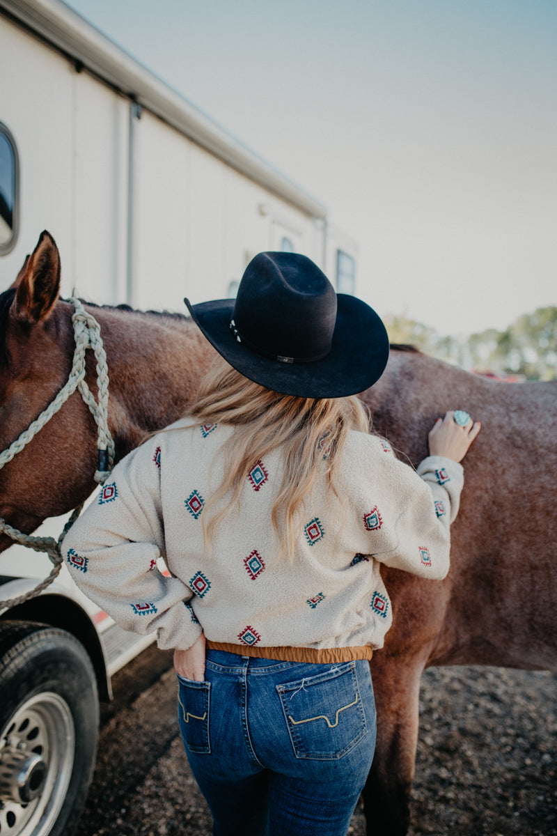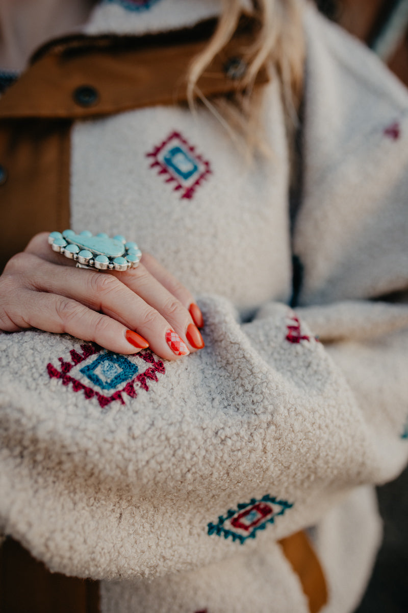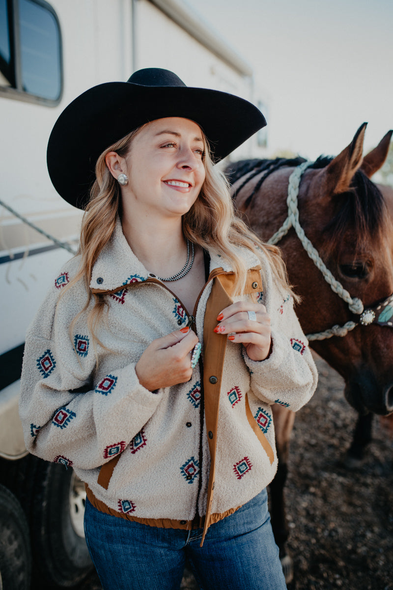 You can't go wrong with a sherpa jacket, especially this 'Kinslei' Ariat Cream Sherpa Jacket! The burgundy and turquoise Aztec print add the right amount of western flare! This sherpa has caramel canvas accents a front zipper and button closure. The texture on this beautiful jacket is phenomenal and super warm perfect for fall weather!