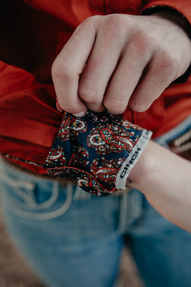 We are loving this dreamy rust button down from CINCH, perfect for fall fairs, competitions, or even the office. This shirt has a beautiful navy blue contrast cuff with paisley detailing. The long shirt tail makes this an ideal performance shirt for riding!