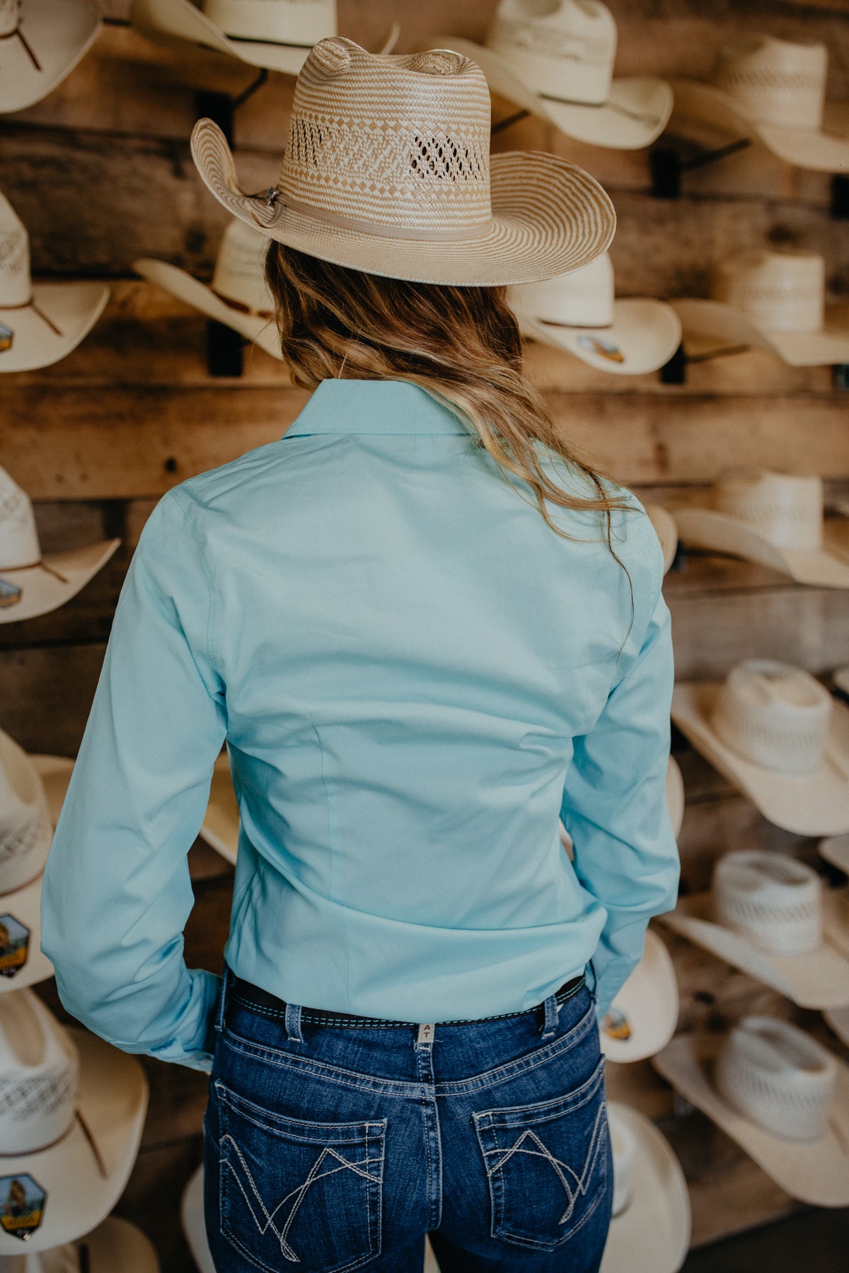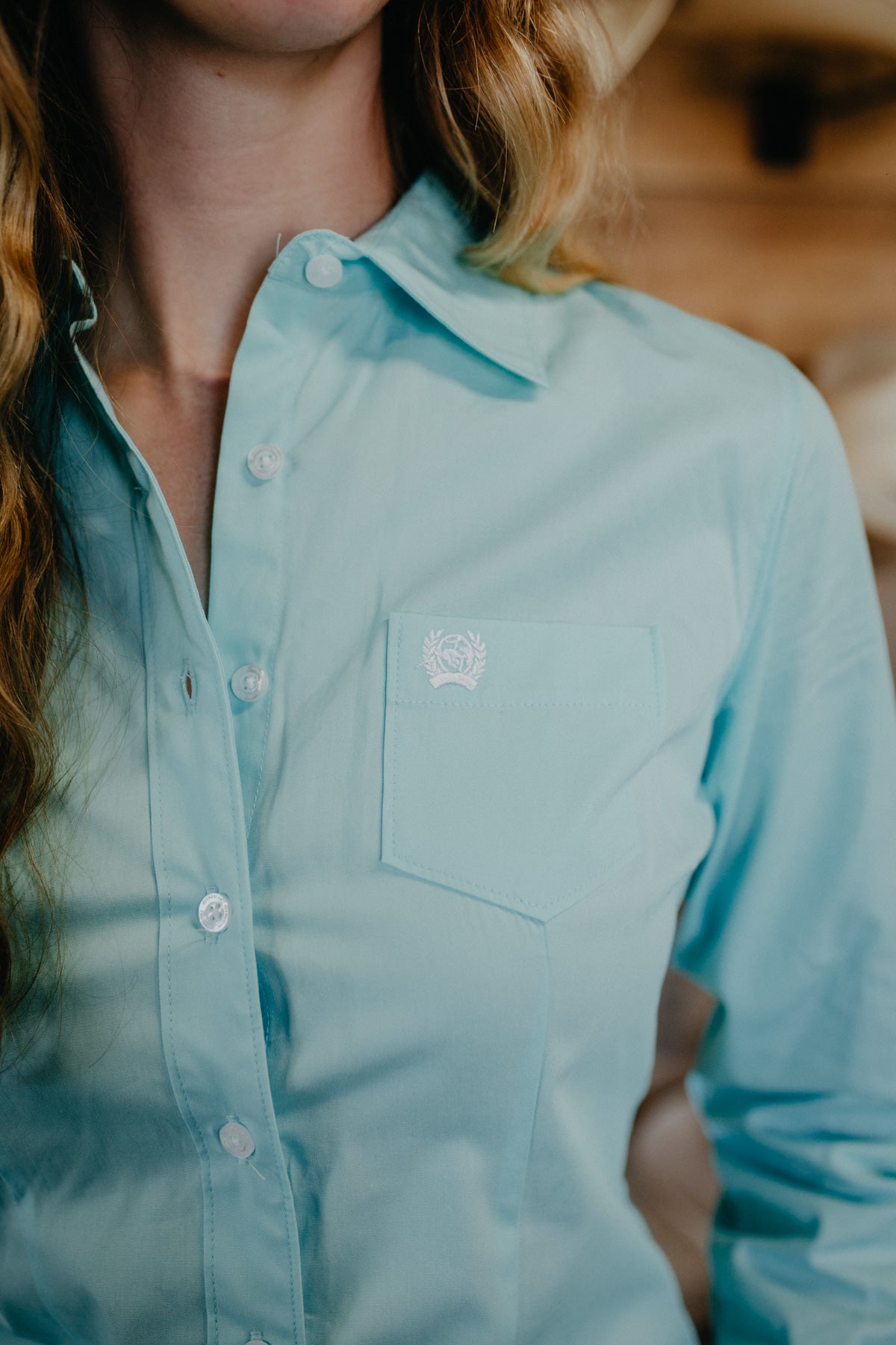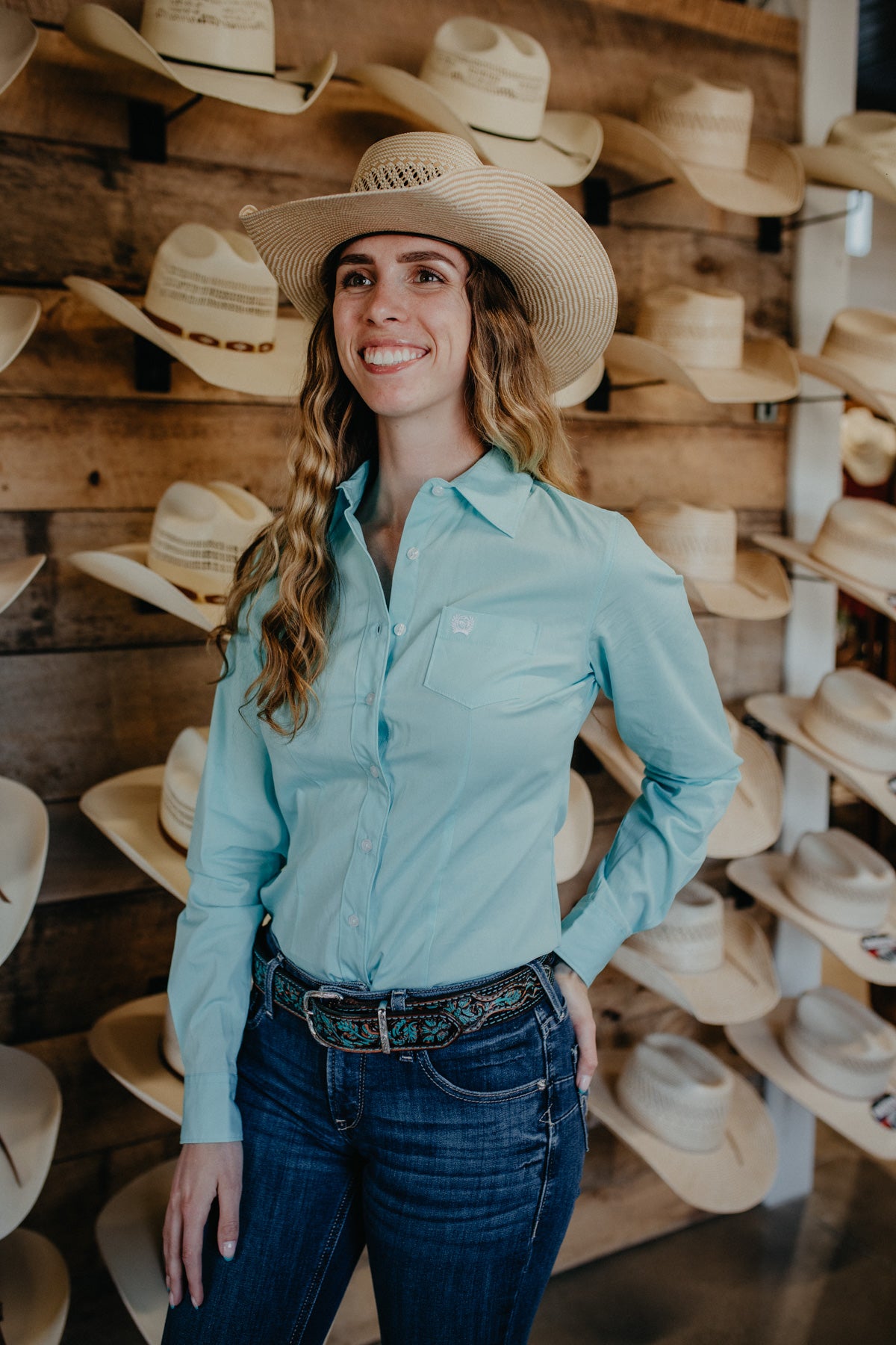 Make a bold Summer statement with this bright turquoise button down! Perfect for the hot days at the barn or arena, this long sleeve will pair with any of your favourite riding jeans. 100% cotton fabric will keep you cool and comfortable, too!