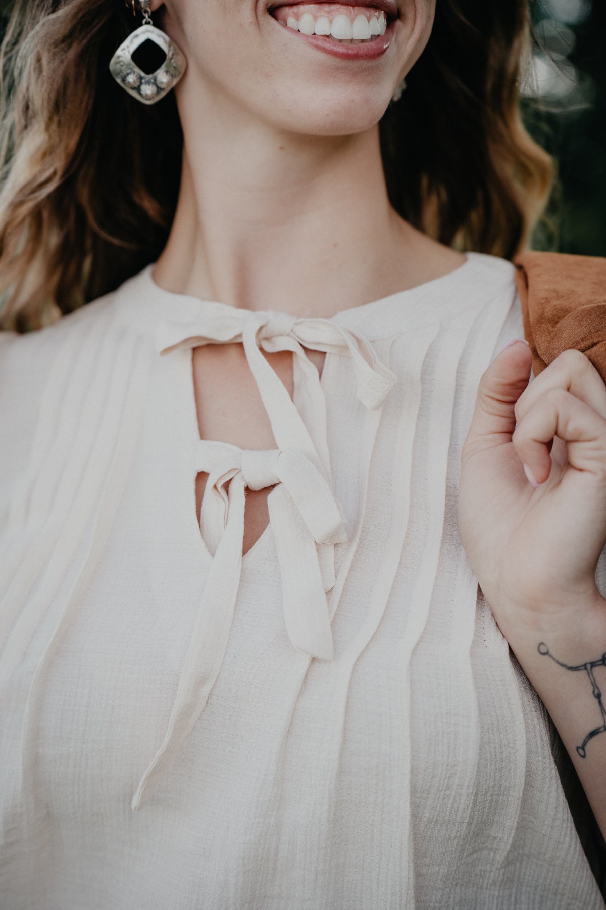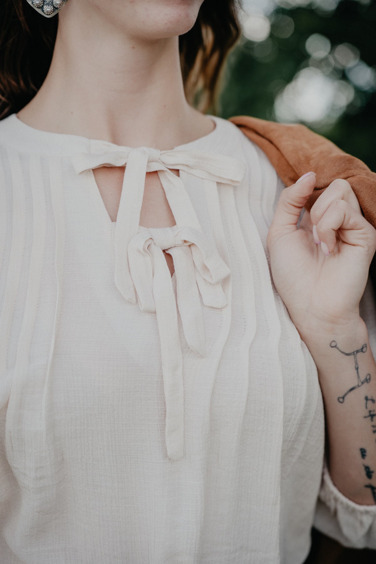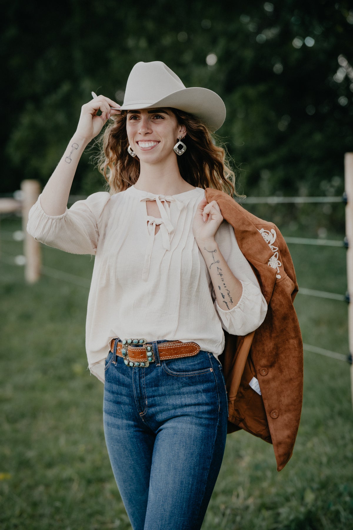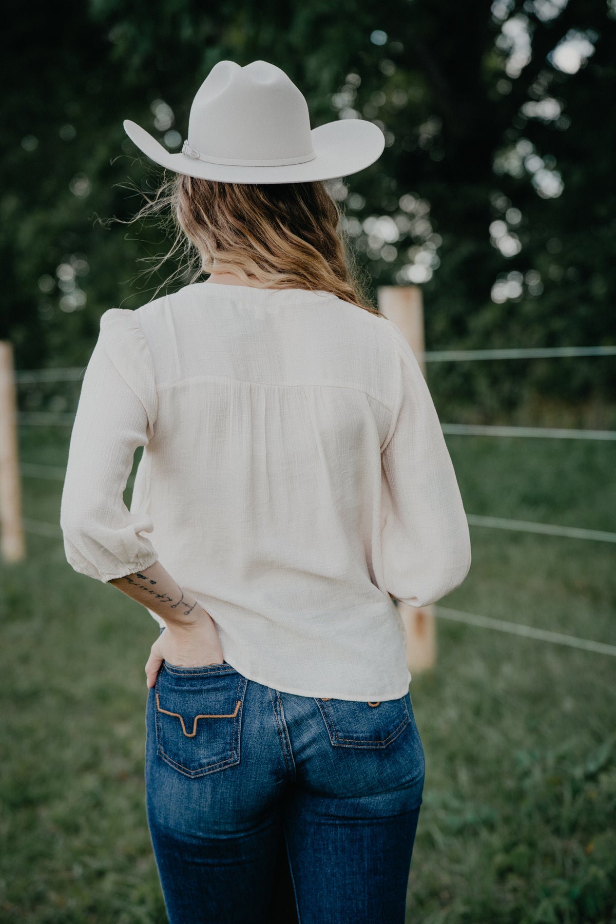 Light, breezy, and full of prairie-inspired charm, our 'Lori' Blouse is made for the western woman who wants comfort without sacrificing style! With its soft peasant silhouette and flowy fit, it’s perfect for everything from a day at the farm to heading into town for dinner after chores. The double tie bow neckline adds a sweet, feminine touch, while elasticated cuffs and a relaxed hemline keep it practical for moving through your day. The light khaki tone pairs effortlessly with denim, boots, and all your go-to fall layers; an easy favourite for living and working the land with grace and style.