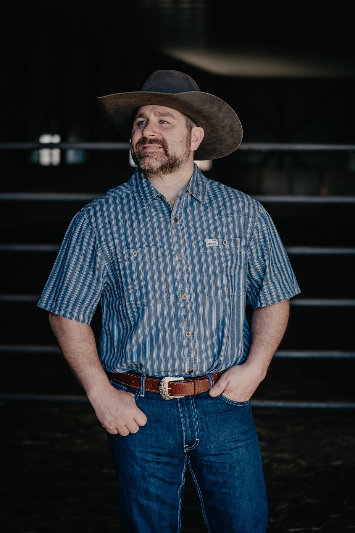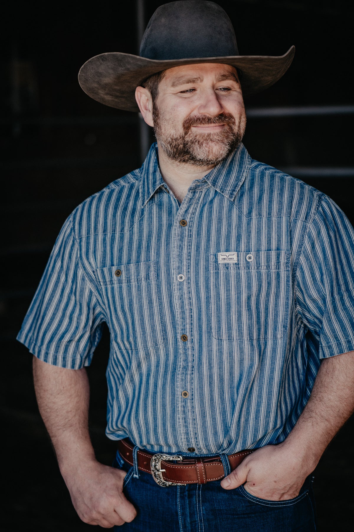 Embrace classic Western style with this men’s short-sleeve button-up. Featuring a classic blue and white pinstripe base, this shirt combines timeless style with rugged appeal! The chest pockets add a practical, authentic touch, perfect for stashing small essentials or adding to the Western aesthetic. Whether you're on the ranch or out in town, this shirt is the ideal blend of comfort and style for any modern cowboy!