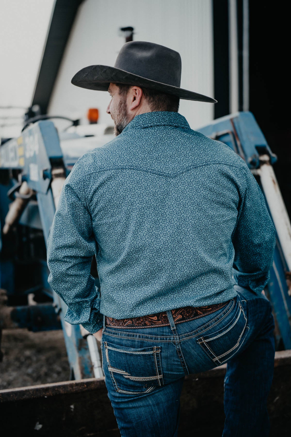 Wrangler has done it again, this classic looking men's shirt features a tonal blue botanical pattern and dark marbled pearl snap finishes. With contrast plain denim coloured cuffs and interior, these blue colours are sure to look good on any man!