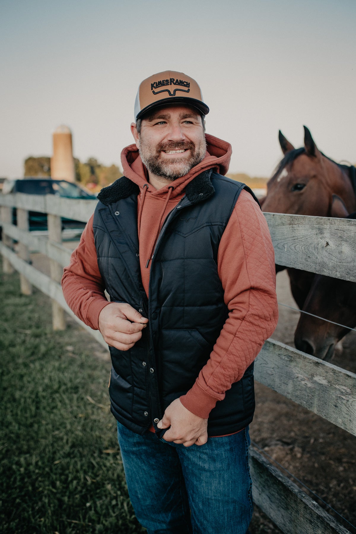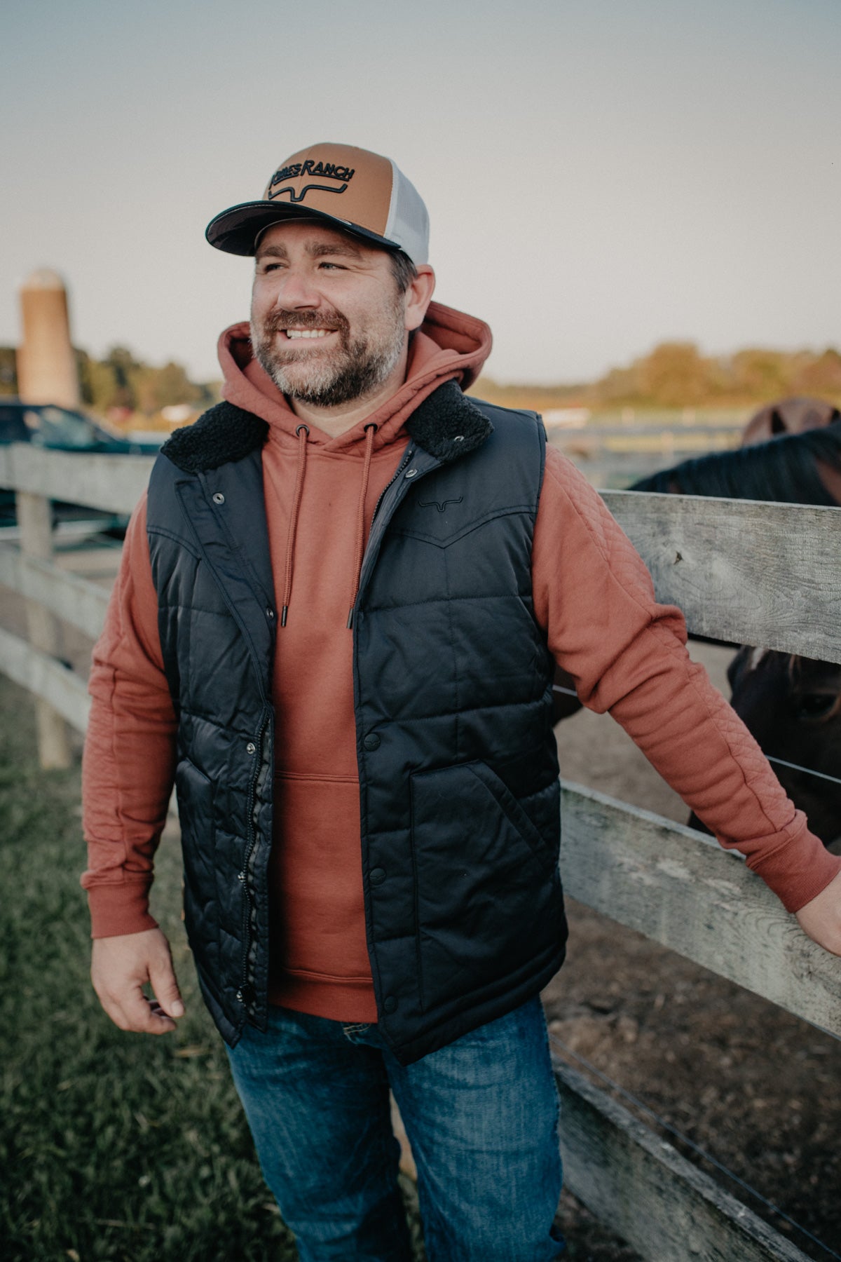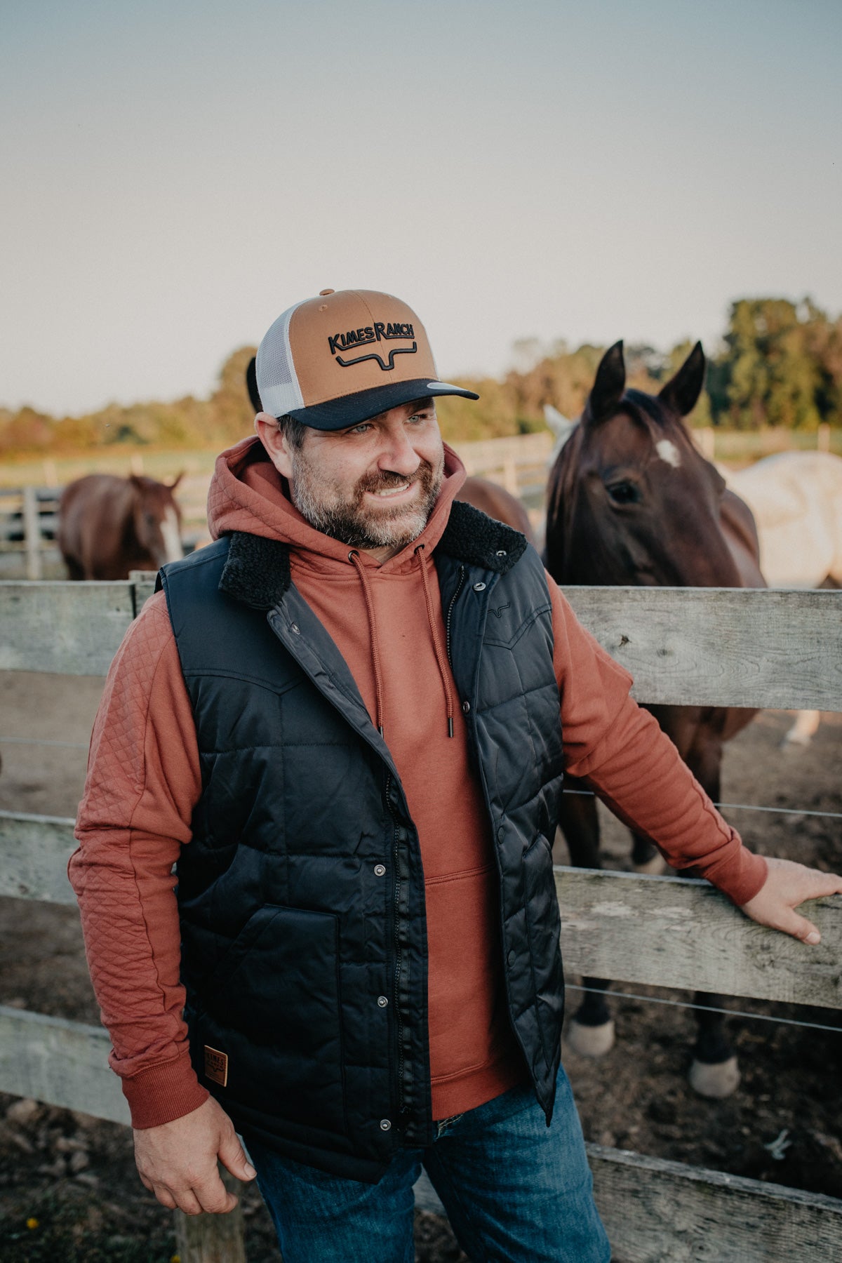 A new style quilted vest from Kimes that we anticipate to be a customer favourite! Between the sleek, simple look - solid black with tonal black of black longhorn logo embroidery with will pair with any shirt or sweater, durable construction, and the cozy black sherpa lining that offers comfort and warmth, along with the subtle western yoke that adds western style.