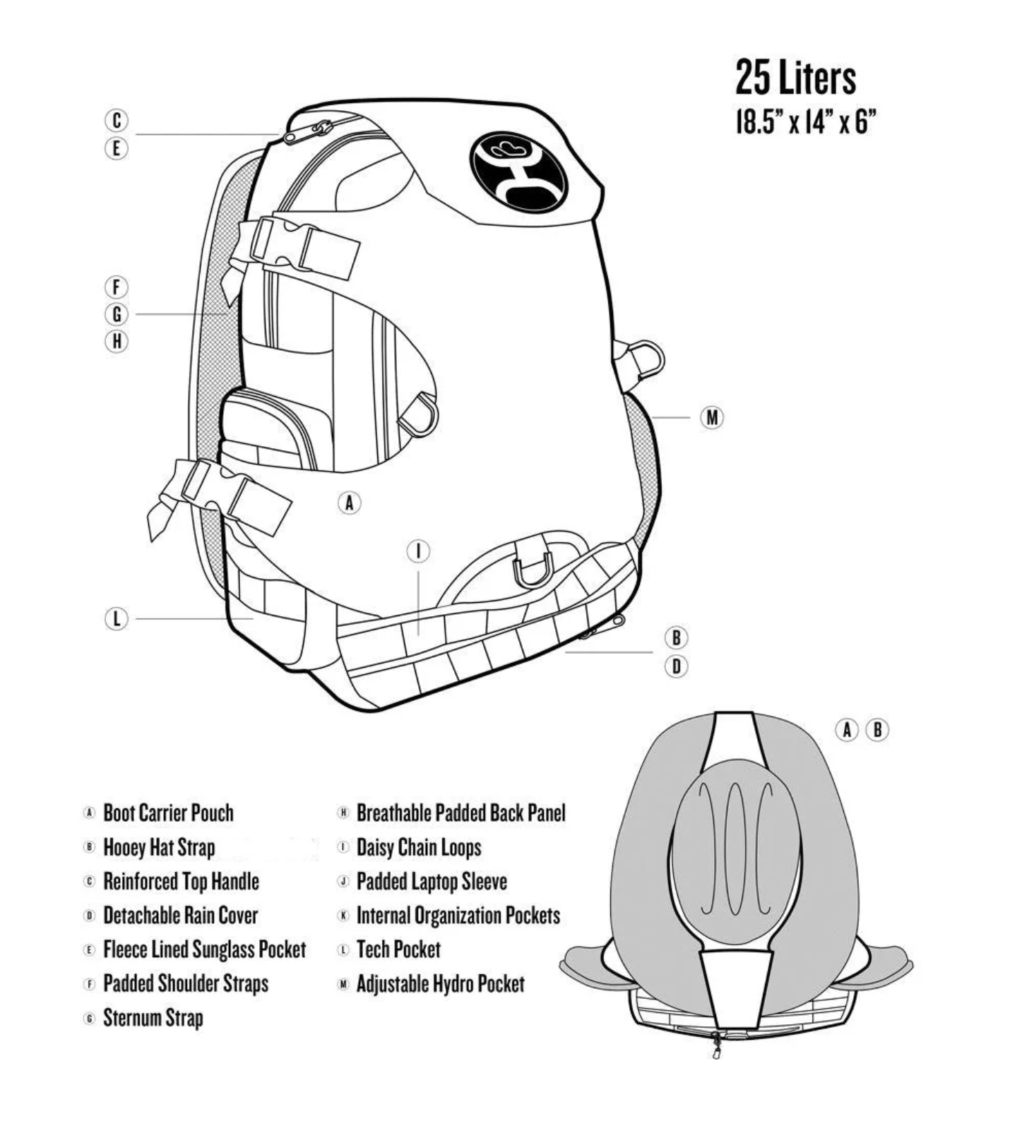 This novel "Mule" backpack by Hooey is everything you need to be rodeo ready! Designed to cart both your boots AND your hat around with ease using a Hooey patented hat strap design. This high capacity bag can haul everything you need! Constructed from durable material and hardware including substantial quality zippers and zipper pulls.
