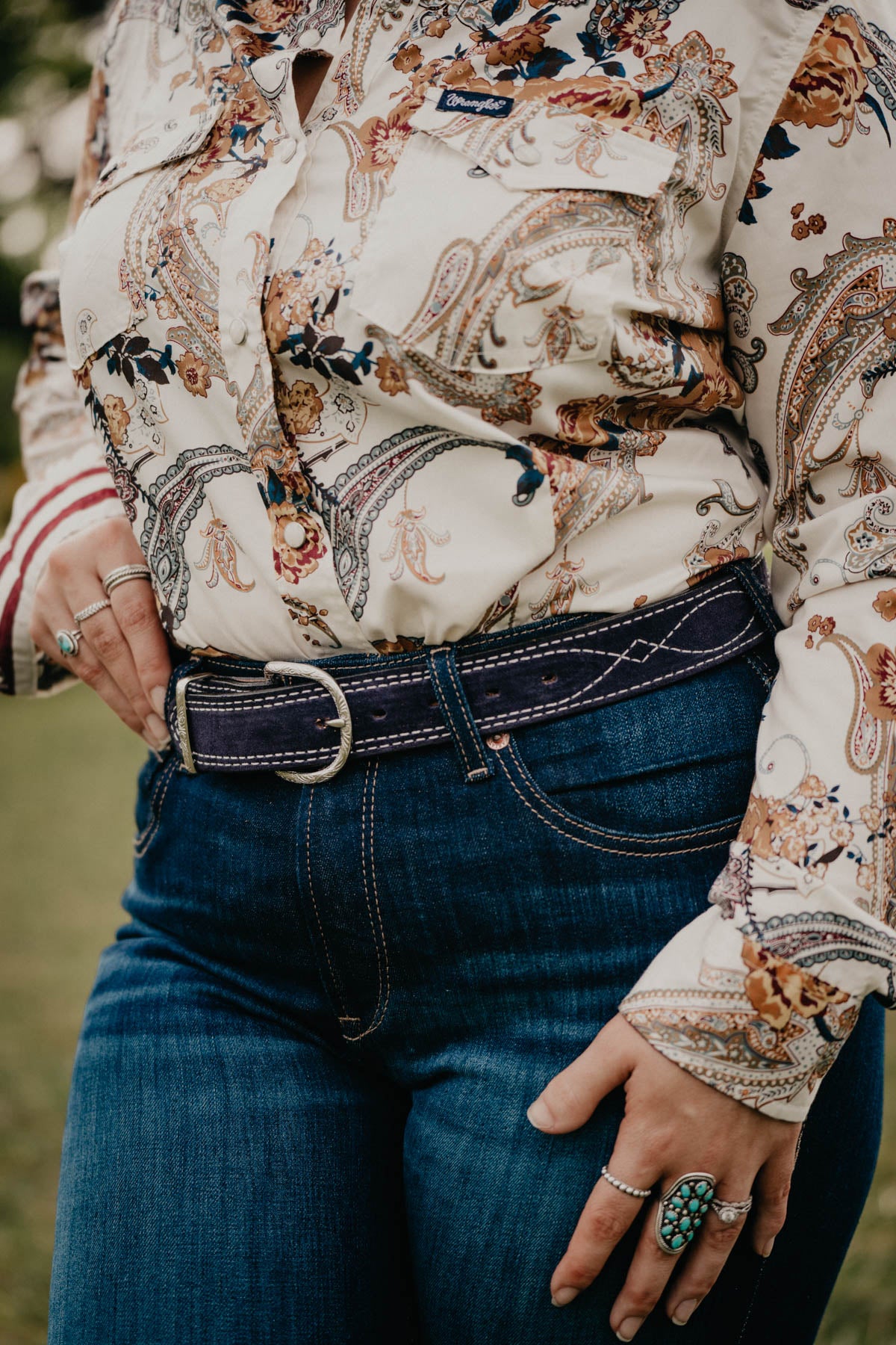 Adding to our offering of Double J Texas handcrafted belts with this simplistic and sophisticated deep navy suede belt with figure 8 stitching and a silver coloured buckle and keeper. The leather quality will have you swooning - this is undoubtably a belt you will still be wearing proudly years to come!