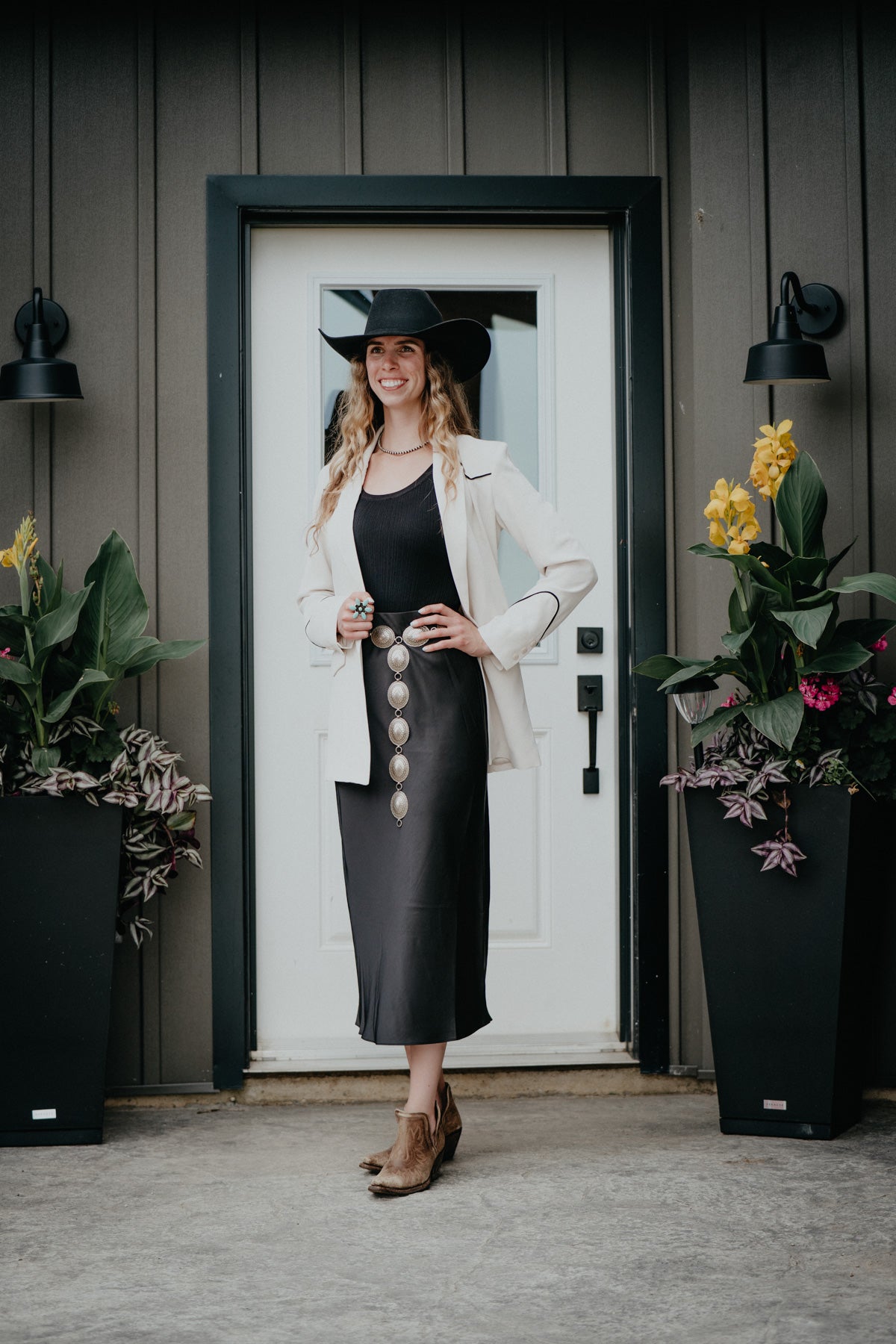 Paired here with our ribbed bodysuit and black satin Z Supply midi skirt.