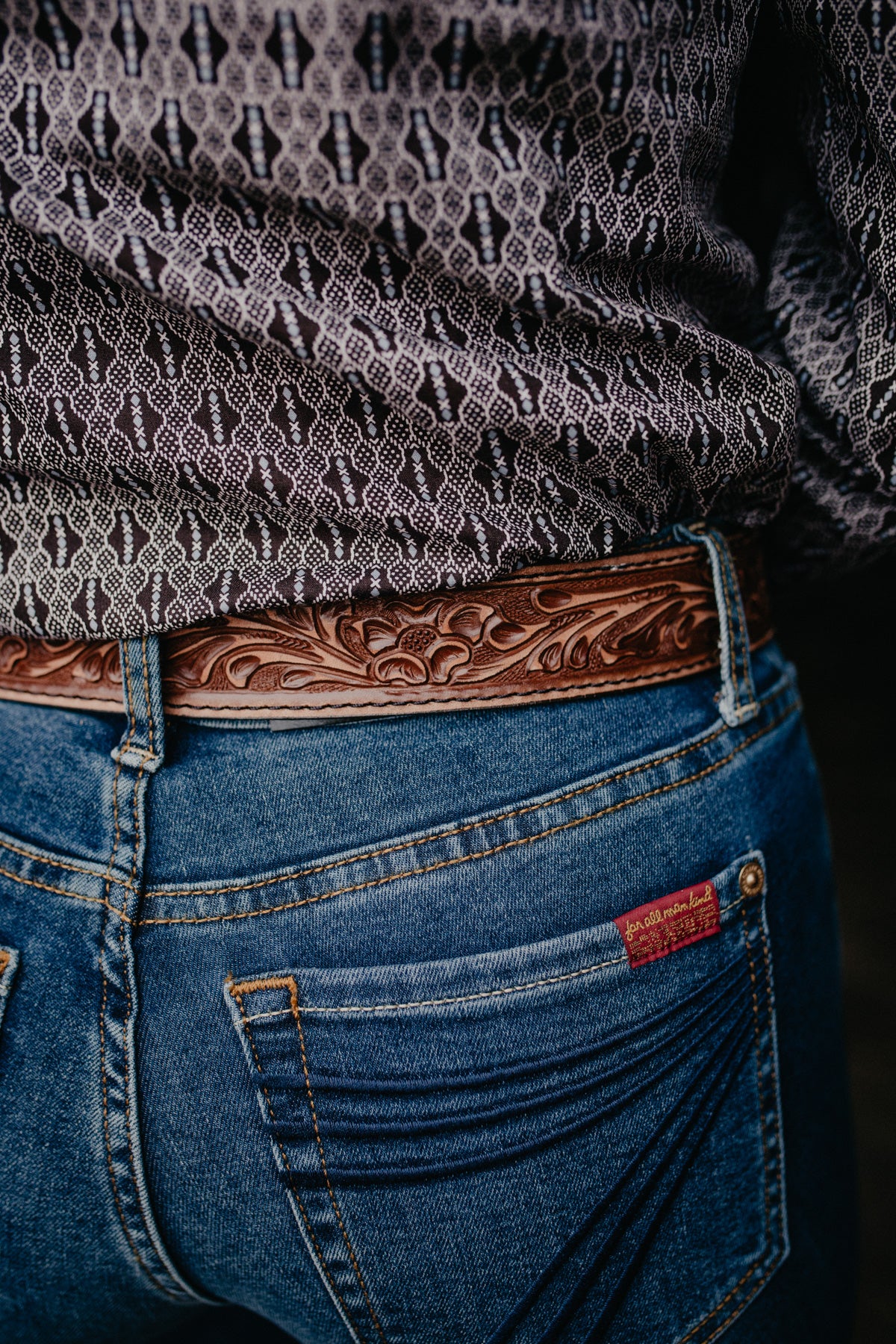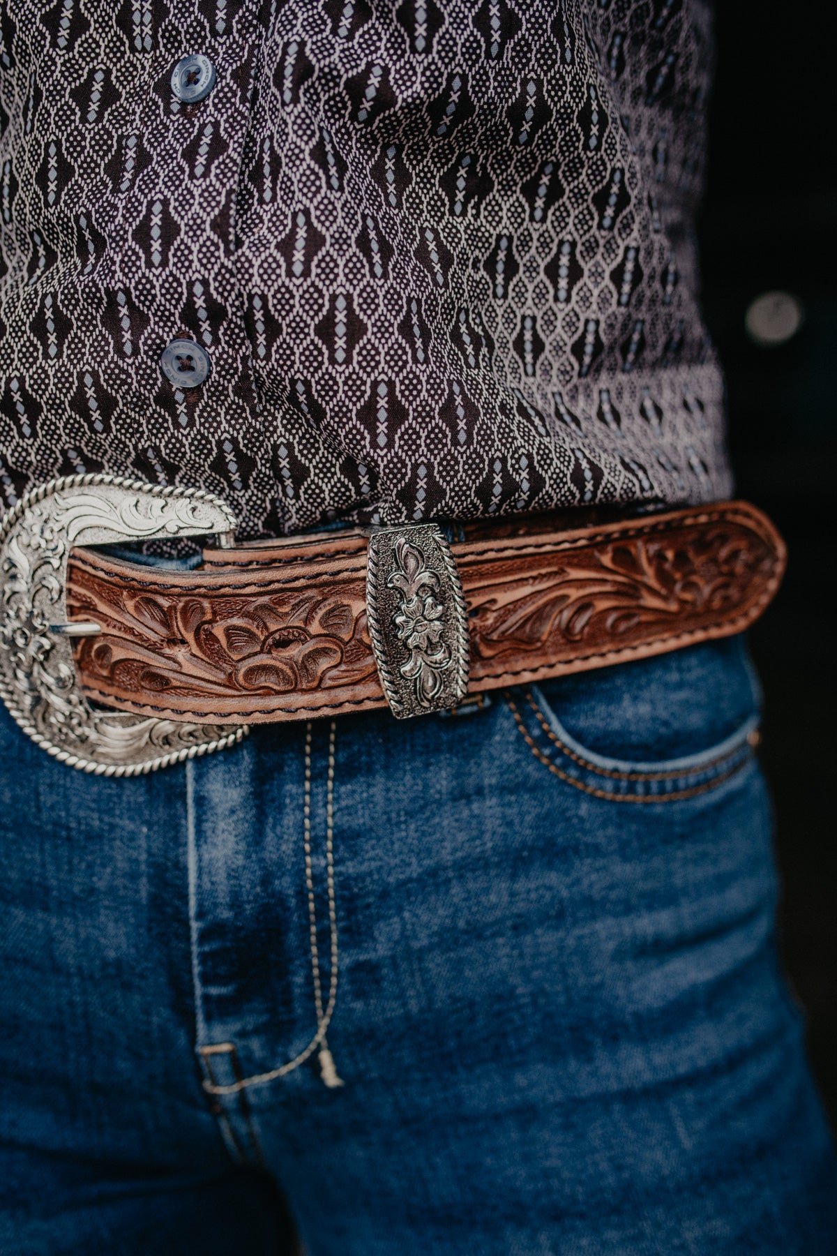 We are excited to expand our Double J belt offering with this gorgeous pecan coloured tooled leather belt handcrafted in the USA, finished with gorgeous vintage style silver floral buckle and keeper, and black stitching.