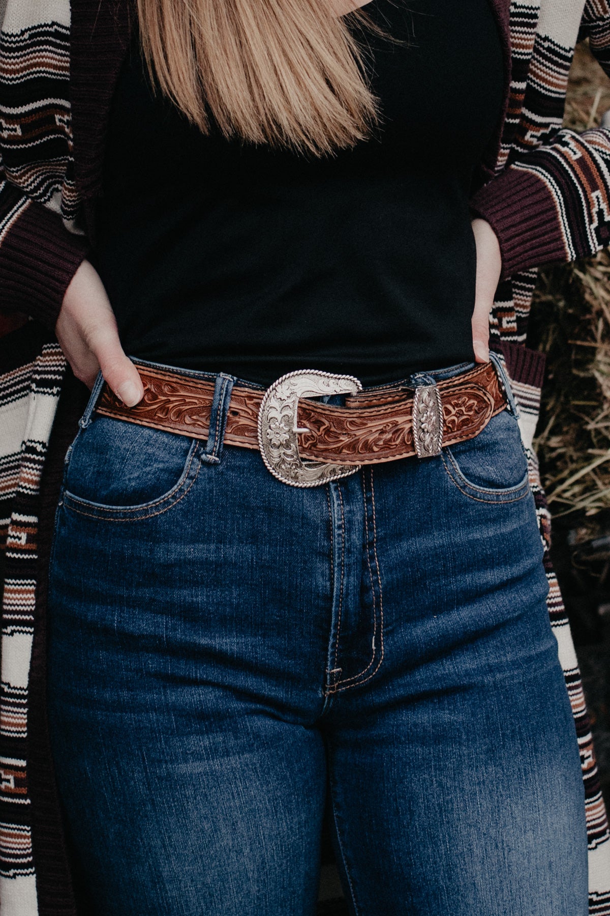 Belt Sizing Tips: Generally speaking, you want to add approx 4" to your denim sizing if you plan to wear with a large buckle, 6" if you plan to wear with existing hardware or a smaller buckle. For example, Tara is a consistent size 27 in denim and comfortably wears a 34" Double J belt with the hardware it come with.