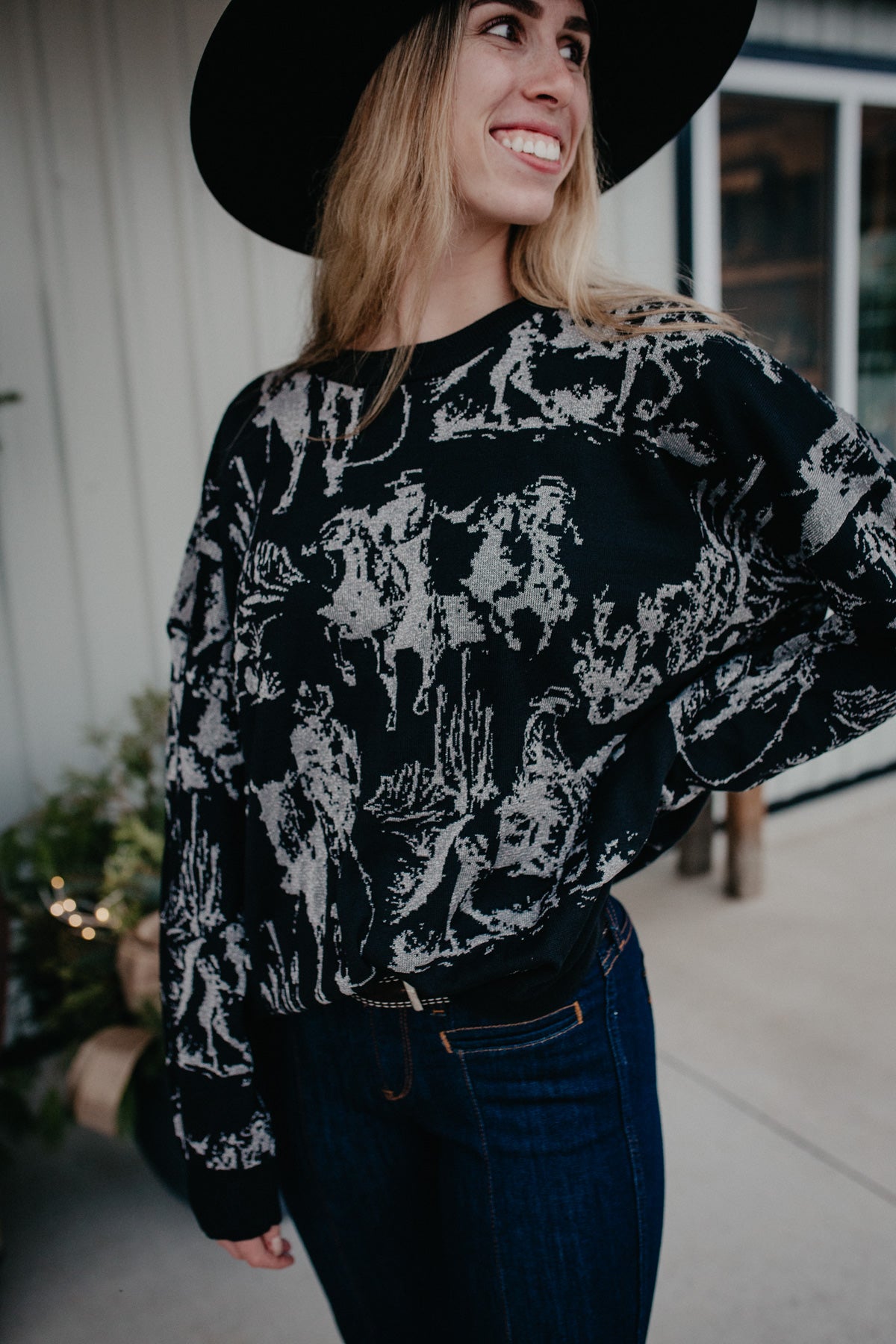 Add a little sparkle to your wardrobe this holiday season with this eye-catching knit by 2 Fly Co.! We LOVE their oversized sweaters 'round here, and this one is definitely *chefs kiss*! Non-itchy metallic and black knit with all-over western graphic will keep you looking cowgirl chic while remaining comfortable from day to night!