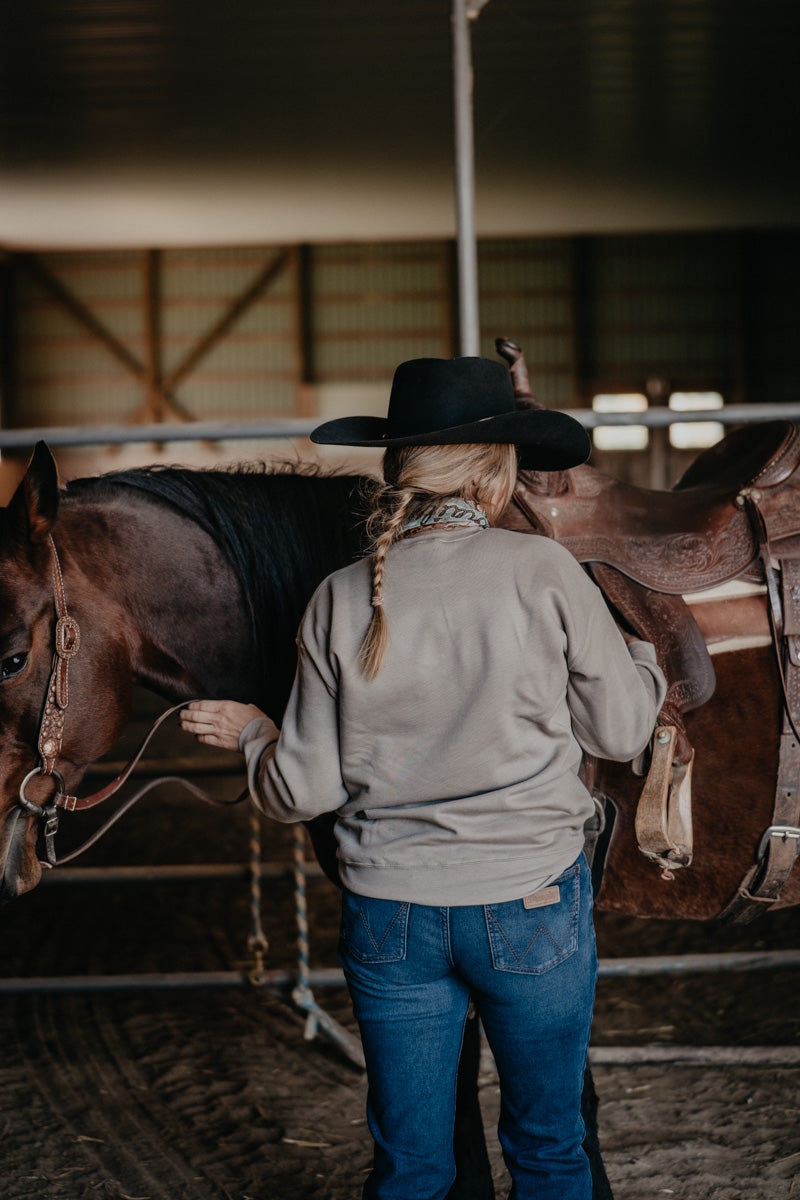 This cozy crewneck sweater in warm heather stone is your ticket to Western-inspired comfort! The chest features a lively graphic of cowboys and western brands corralled within a rope border, topped with a longhorn cow. Perfect for those who appreciate a little frontier flair mixed with modern casual wear!