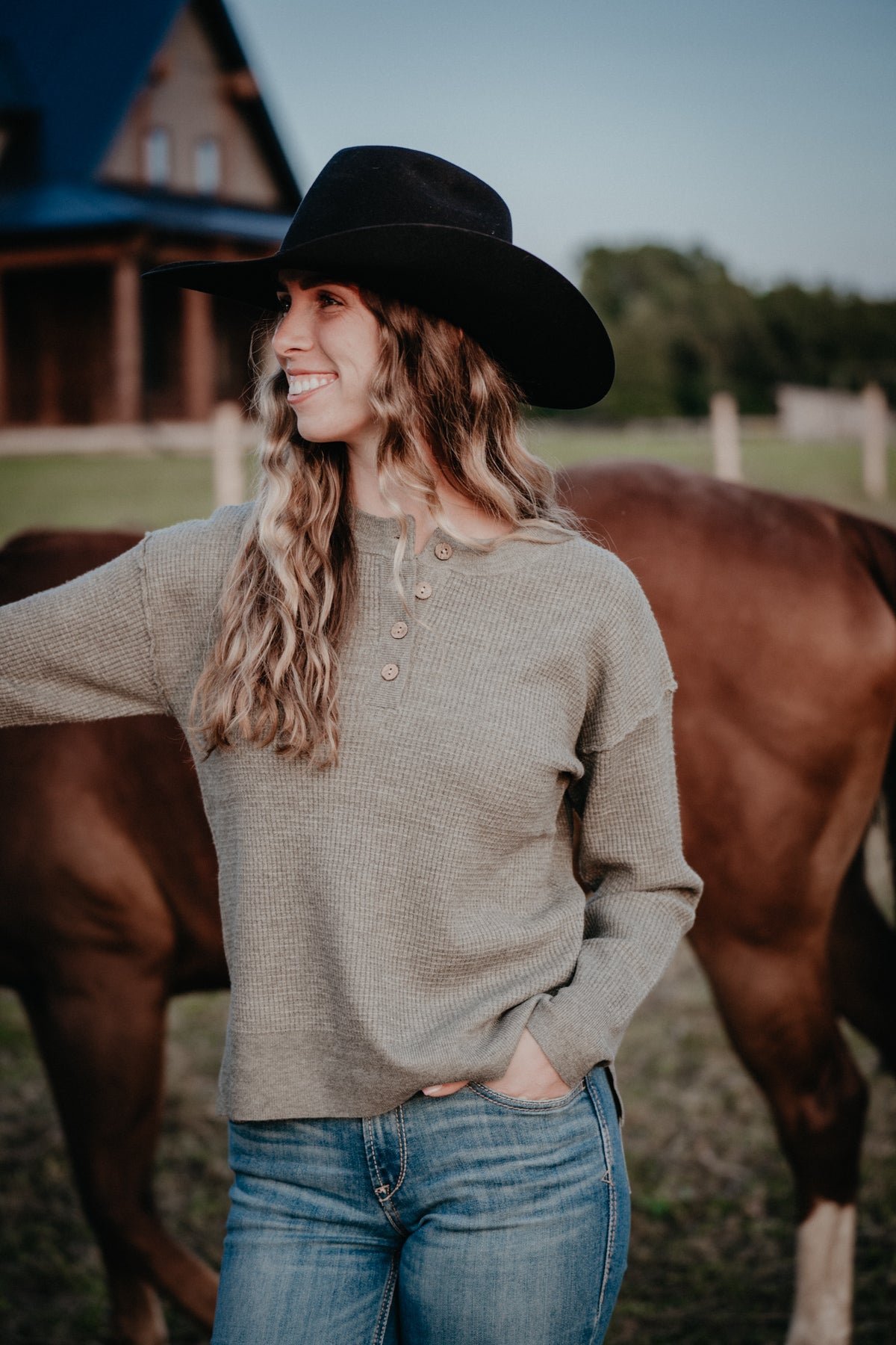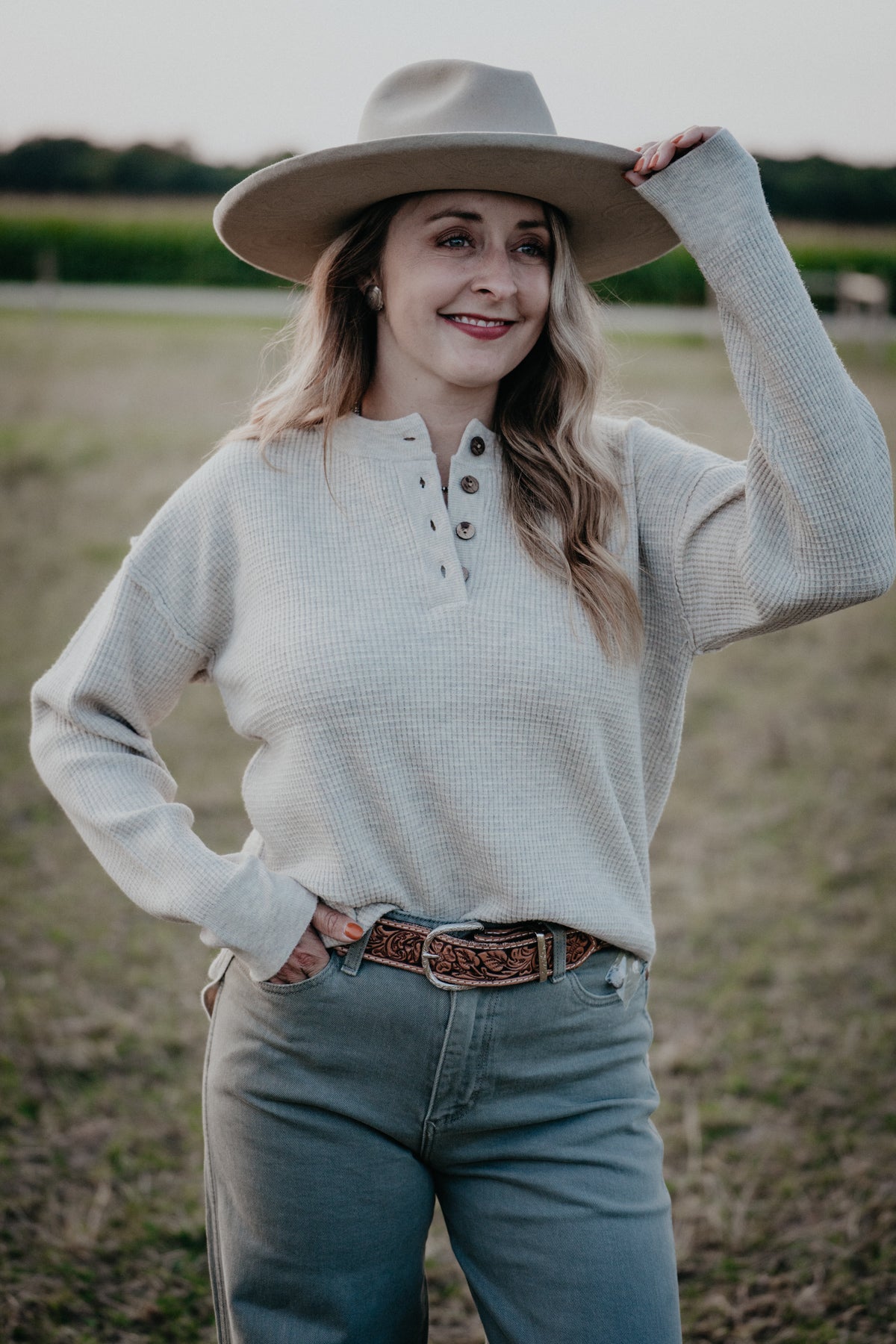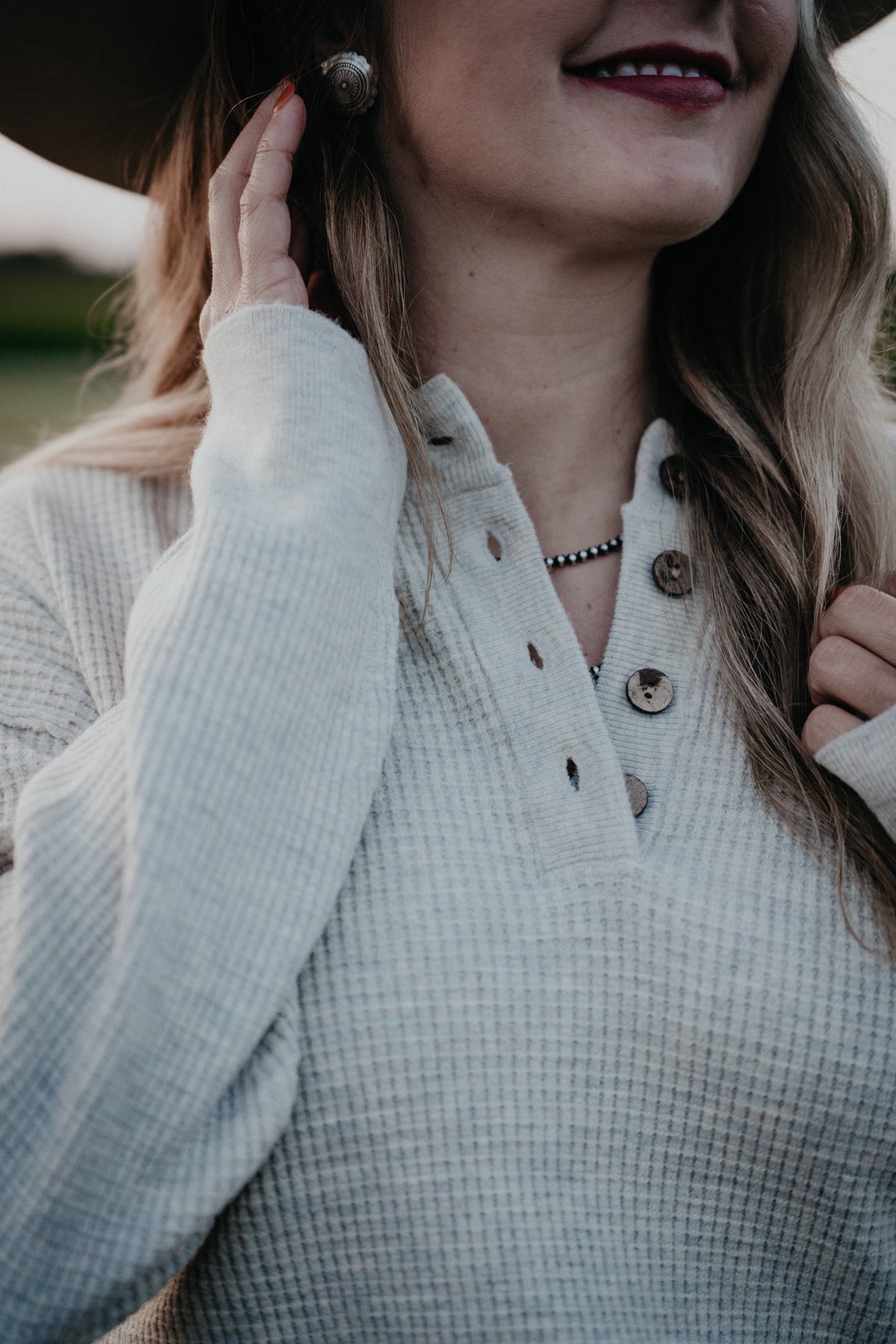 The 'Wendi' Waffle Knit Top brings cozy vibes with a playful twist. Featuring a henley style with faux wood buttons, long sleeves, and a cute small split hem, it’s perfect for layering as temperatures drop. The waffle knit fabric adds texture and warmth, making it ideal paired with leggings or your favorite denim. Choose from two delightful shades—classic oatmeal or creamy olive—to brighten up your fall and winter wardrobe.