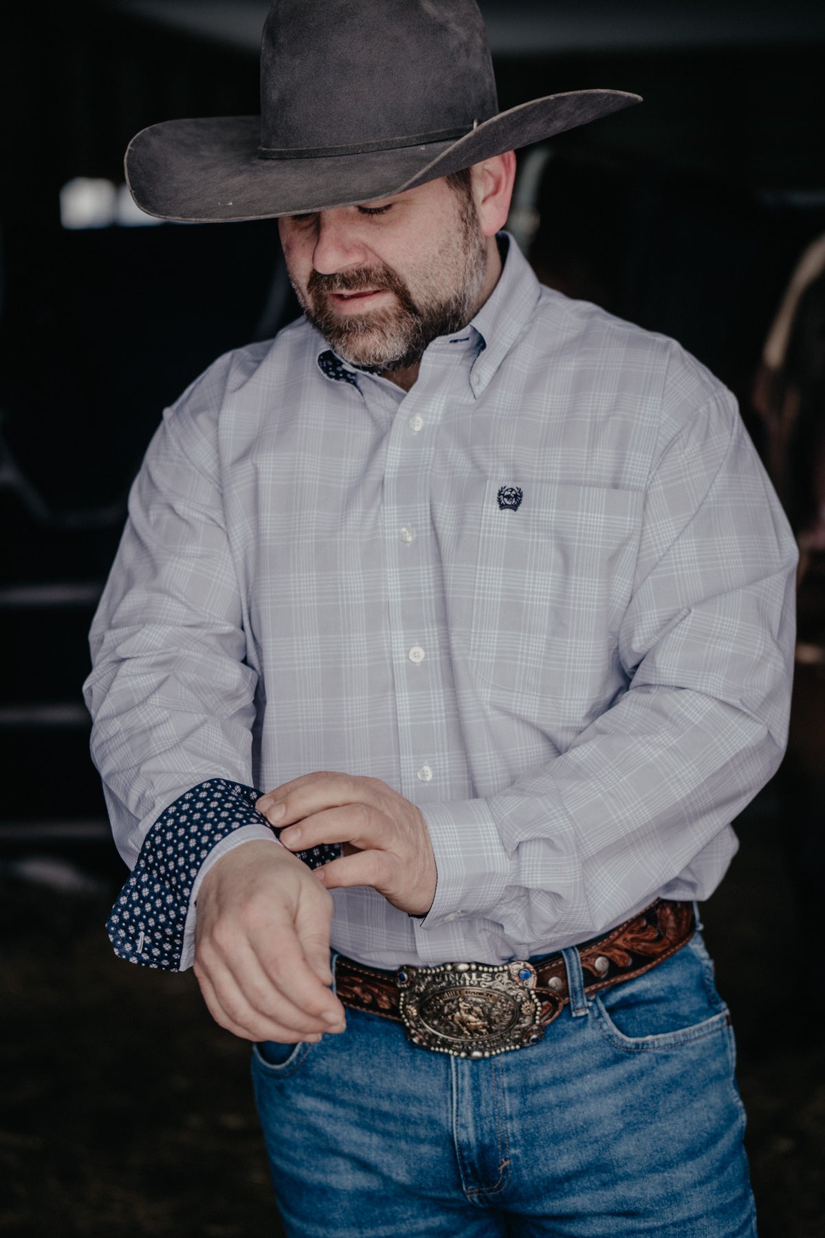 This men’s classic fit CINCH button down is one of many amazing performance shirts we offer. A solid grey plaid base with geometric contrast cuff pattering this shirt is great for in the saddle, performance wear and just everyday! The long tails keep this shirt tucked in no matter what you do!