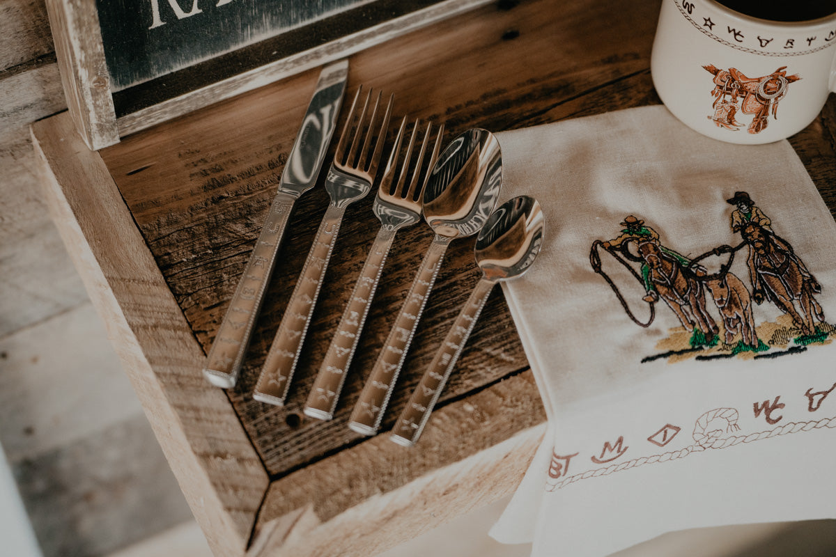 Engraved with cattle brands this 20 piece Flatware set is going to complement every ranchers or western enthusiasts table. Crafted with top quality stainless steel (18 /10) making this a very sturdy set, and is dishwasher safe to boot.