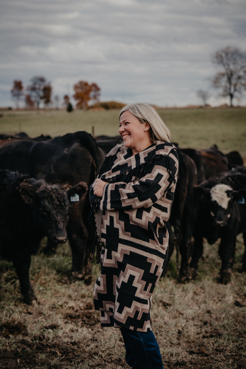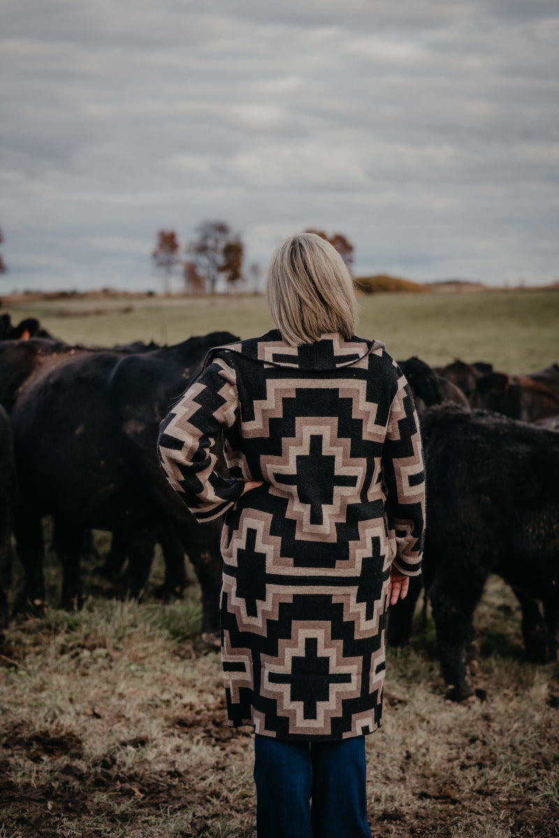 Wrap yourself in Ariat's 'Janine' cardigan coat—a thick, luxuriously soft knit that's as cozy as it is chic. This showstopper features a striking Southwestern pattern in rich creams, browns, and blacks, complete with a fringe-lined shawl collar that adds instant flair. Perfect for family photos or dressing up your everyday look, this versatile piece delivers the quality and style that makes every outfit feel effortlessly put-together.