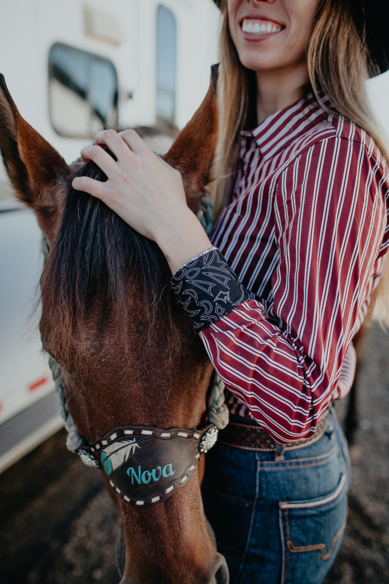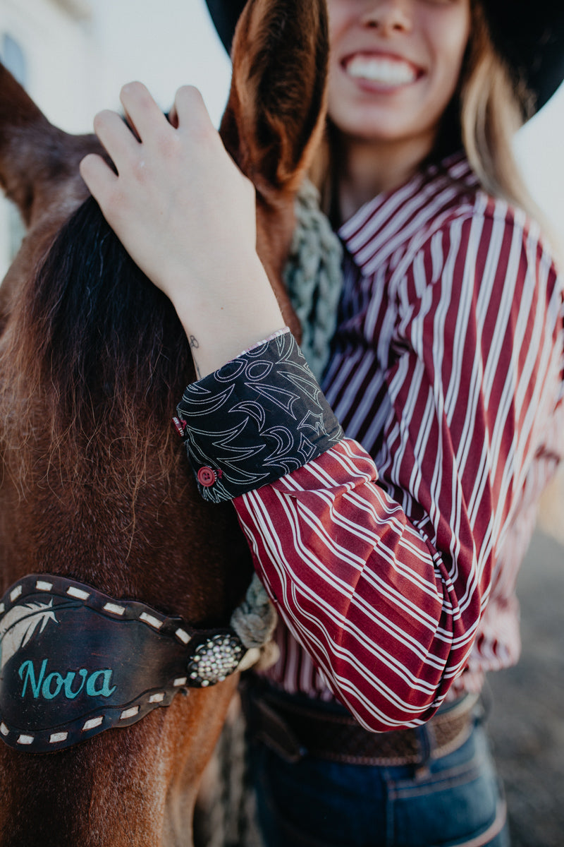 This beautiful Ariat pinstripe Cabernet and white Button up is sure to be a show stopper this fall. The contrast black and white boot stich cuffs are a beautiful addition to this top. Between the color and fabric of this button up is sure to keep you comfortable and stylish this fall season.