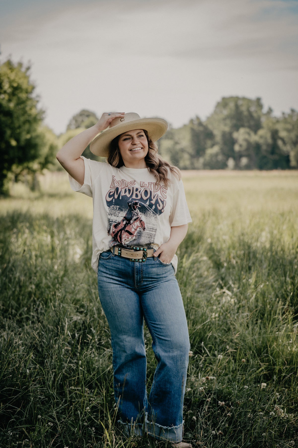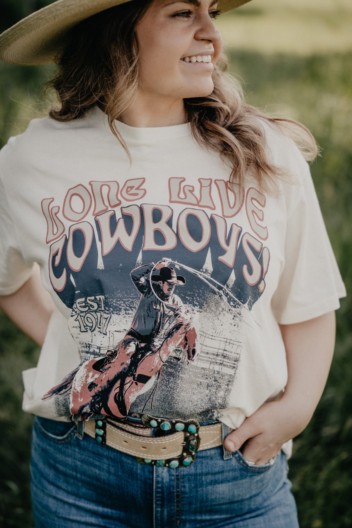 Rooted in Western tradition and ready for the everyday cowgirl - this Wrangler Girlfriend Tee featuring "Long Live Cowboys" font is a tribute to the hardworking spirit of the West! The relaxed silhouette makes it easy to tuck in, tie, or layer. This t-shirt is made to pair with anything and wear from sun-up to sundown.