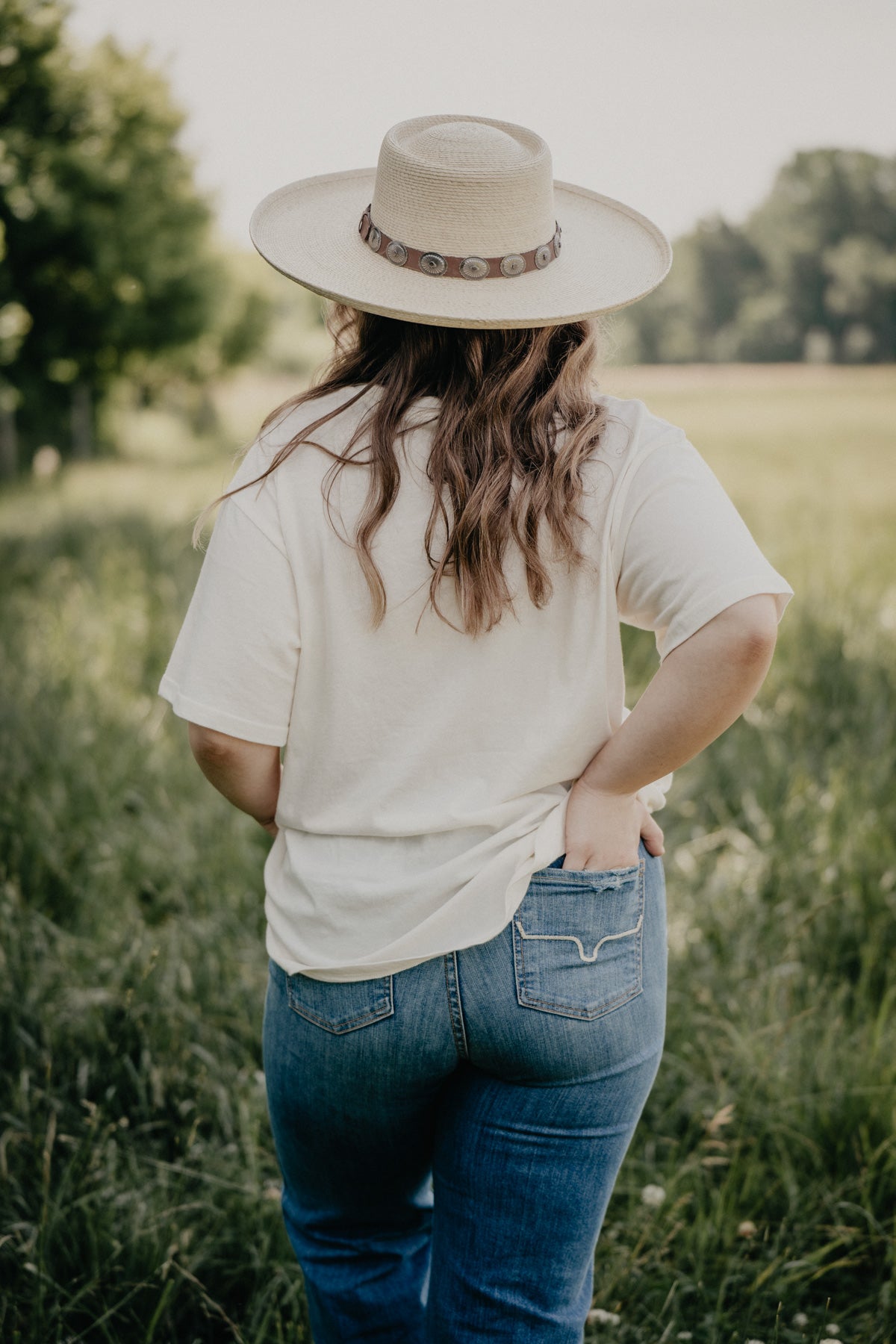 Paired with our Olivia High Rise Stove Top Raw Hem Wide Leg jeans by Kimes Ranch.