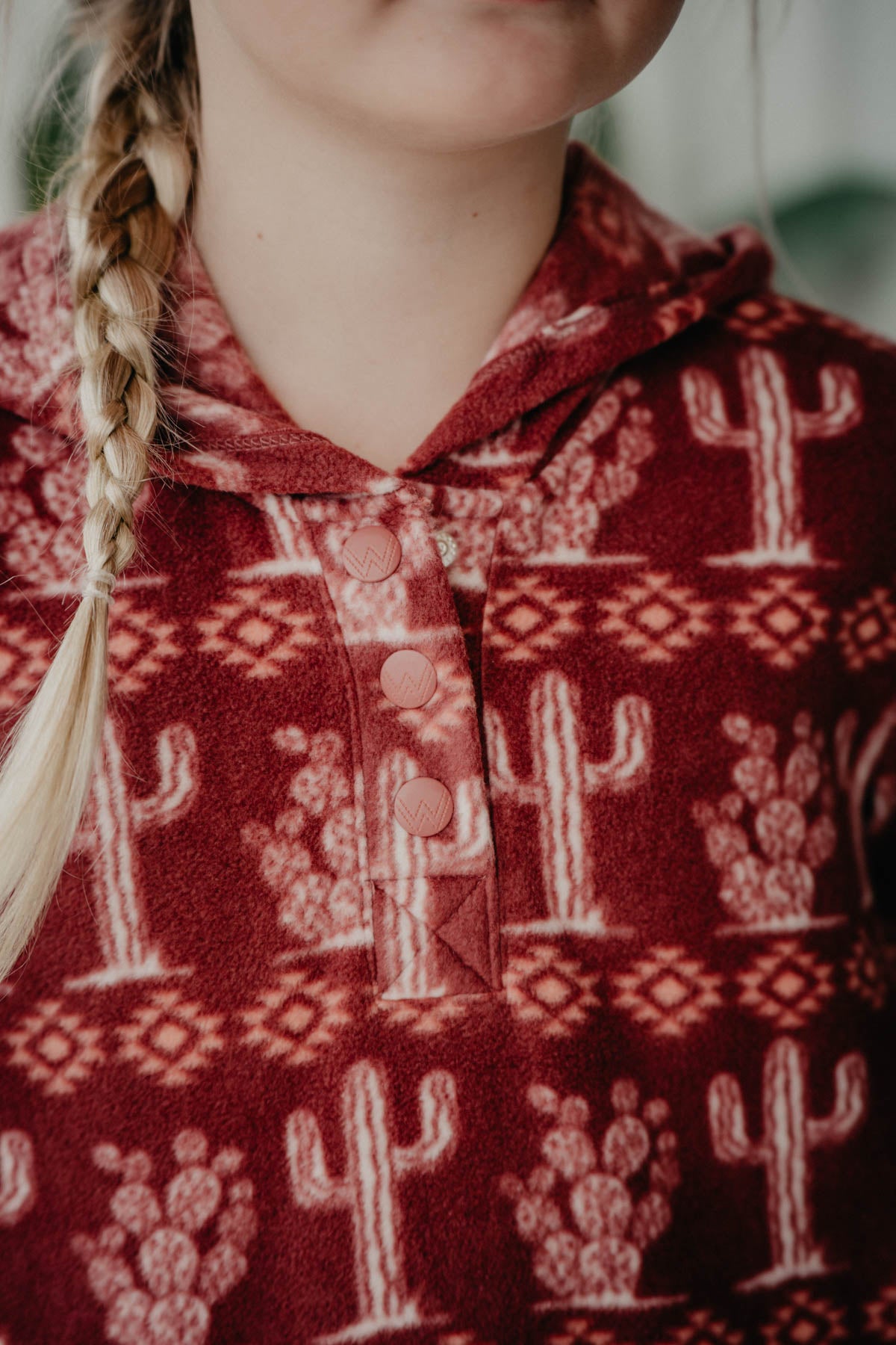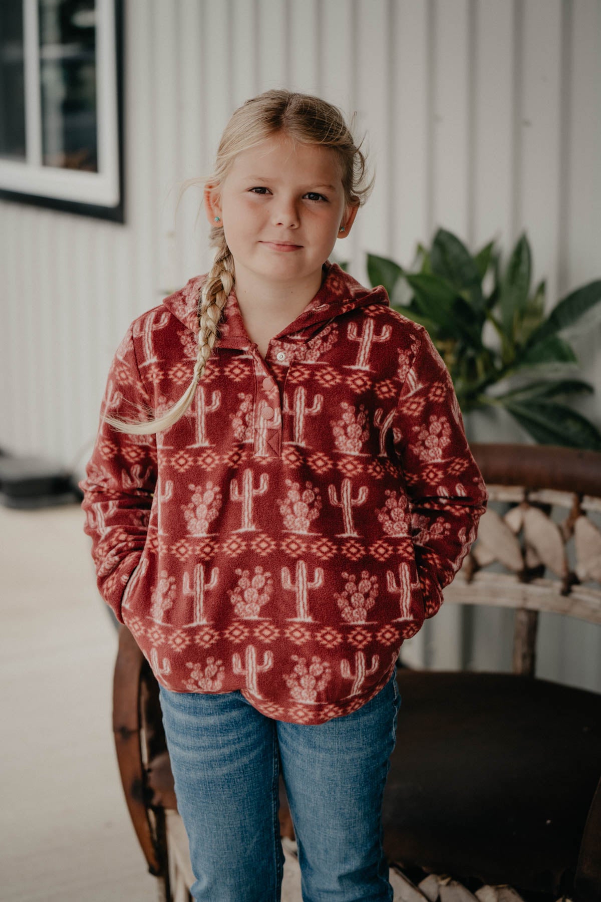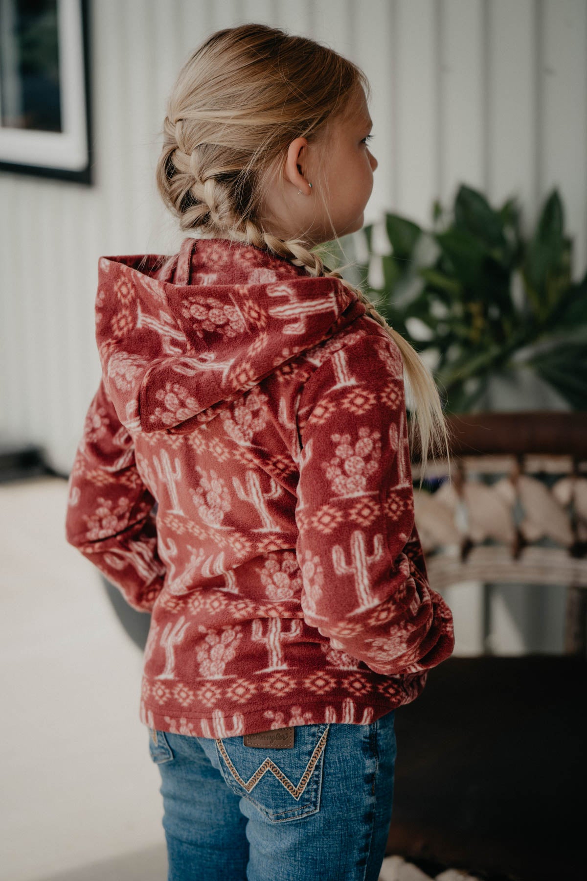 Take on any adventure with our Girl's Cacti Fleece Wrangler Hoodie! Made from a comfortable red fleece material, this hoodie is sure to keep your little cowgirl warm and cozy all Fall and Winter!