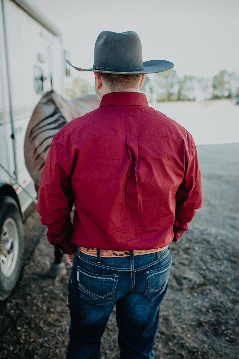 Bring a touch of country charm to your wardrobe with the 'James' Men's Wrangler Solid Burgundy George Strait Button-Down Shirt! Its rich deep burgundy color pairs perfectly with your favourite pair of denim! Designed for comfort and style, this shirt is ready to add some charm to your rodeo wardrobe or your night out look!